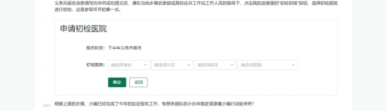 义务兵报名信息填写完毕并成功提交后,请在当地乡镇武装部或高校征兵工作站工作人员的指导下,点击我的进度里的“初检初核”按钮,选择初检医院进行初检。