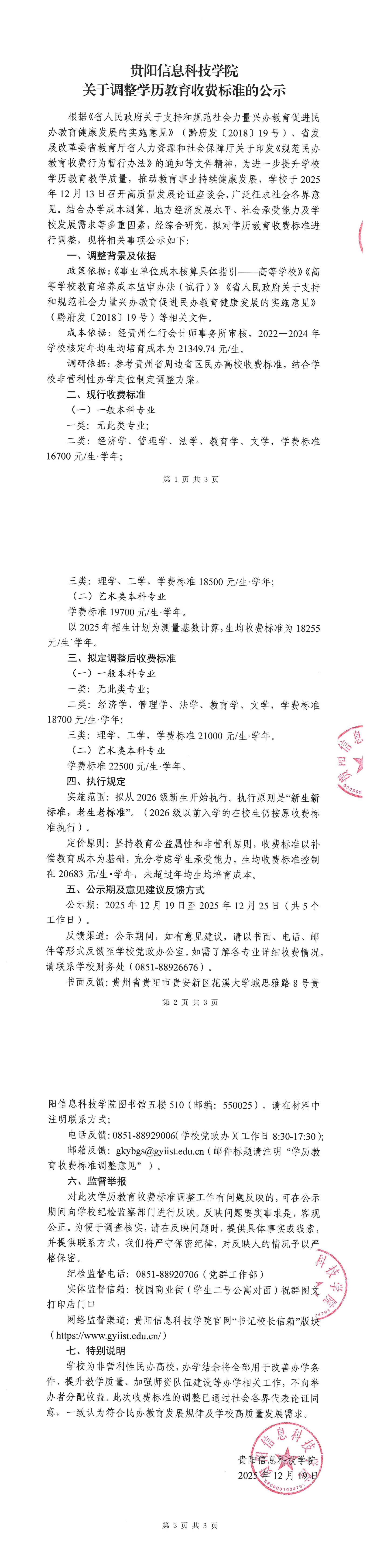 贵阳信息科技学院学历教育收费标准调整公示