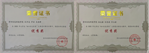 此次获奖不仅是我校学子专业素养与创新实践能力的生动缩影,更是学校深入推进“AI+素养”教育改革的成果体现。未来,我校将继续以赛促学、以赛促教、以赛促改,以赛事为翼搭建更多高质量AI实践平台,持续深化数字素养教育内涵建设,着力提升学子在人工智能时代的核心竞争力,助力贵科院学子在更高层级的赛事舞台上乘风破浪、续写辉煌!