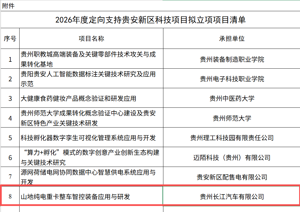 近日,贵州省科技厅发布《2026年度定向支持贵安新区科技项目拟立项项目公示》,我校智能工程学院马震老师与贵州长江汽车优先公司申报的《山地纯电重卡整车智控装备应用与研发》项目,成功获批2026年度定向支持贵安新区科技项目立项。