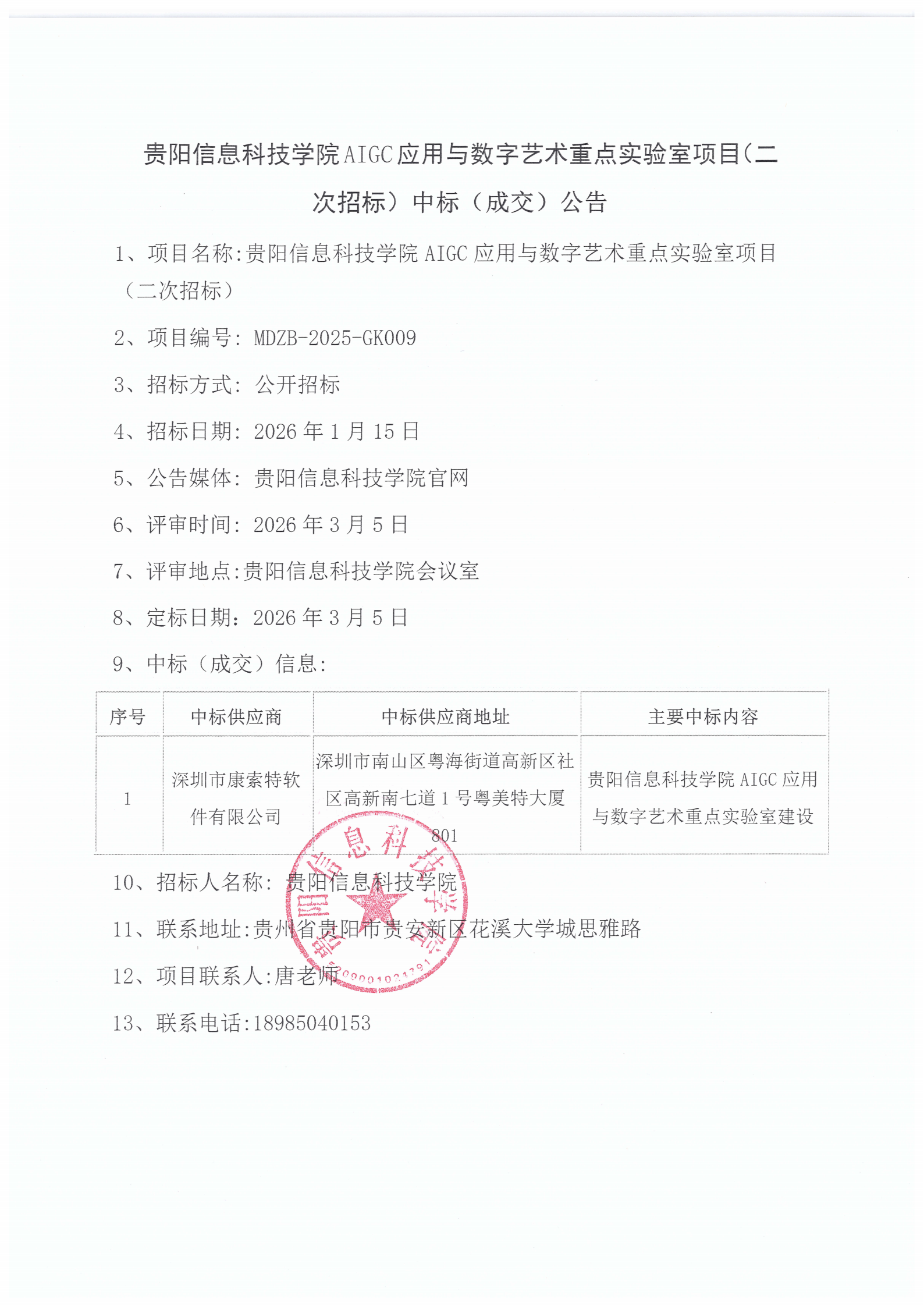 贵阳信息科技学院AIGC应用与数字艺术重点实验室项目(二次招标)中标(成交)公告