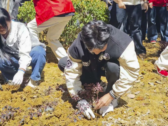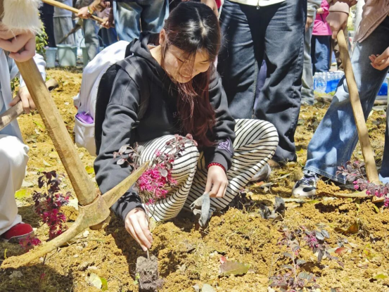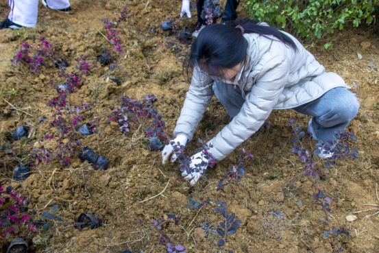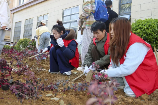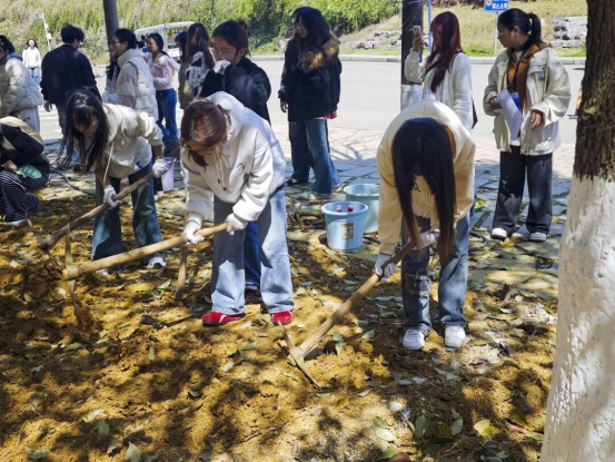 活动现场,志愿者们在提前划分好的种植区域内,有序分发树苗与工具。各学院师生们三五成组、分工协作,弯腰挥锹挖坑,扶苗定根、填土踩实、提水浇灌,每一步都细致流畅。