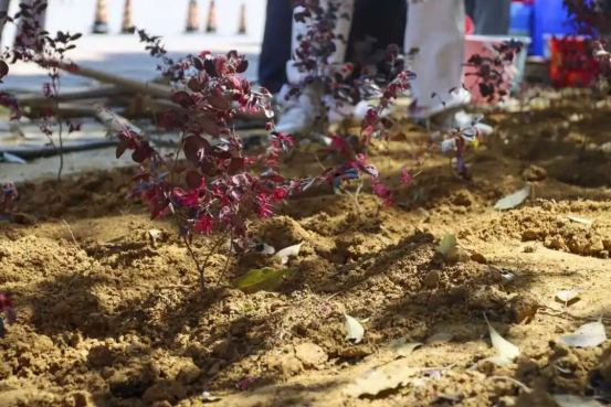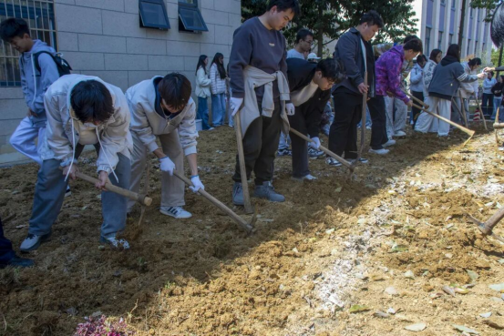 活动在学校教学楼C栋与B栋一楼空地举行。校团委联合学校后勤处准备了灌木树苗,以及肥料、铁锹、水桶、手套等植树工具和饮用水、医用酒精等物资。