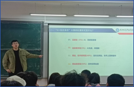 2026年3月25日中午12点10分,贵阳信息科技学院在C207教室顺利举办2026 年“大学生AI + 信息素养”大赛专题宣讲会。本次宣讲由王志翔老师主讲,面向全校学生深度解读赛事详情、备赛要点与激励政策,现场学习氛围浓厚。