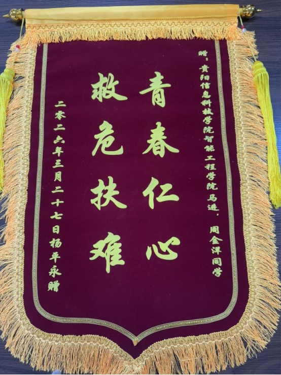 面对“扶不扶”的社会之问,他们没有迟疑,而是用行动作出了最坚定的回答——在他人最需要帮助的时刻,挺身而出。他们不仅“敢扶”,更“善扶”,在守护生命安全的同时,也守住了人心的温度。事后,老人家属杨先生专程来到学校,送来锦旗和感谢信。他在信中写道,两位同学不仅帮助老人脱离困境,更挽回了一个家庭的完整,也让人真切感受到当代大学生的责任与品德。