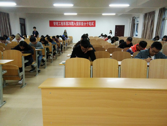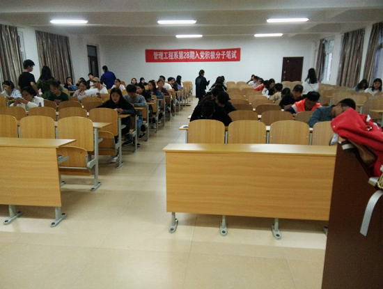 新闻网讯(高开艳供稿)根据管理系党总支2018年下半年党员发展工作计划,2018年9月13日,管理系党总支组织入党积极分子于贵州大学明德学院花溪校区B栋409、508教室进行第28期入党积极分子笔试。管理系党总支全体书记、支委担任监考。