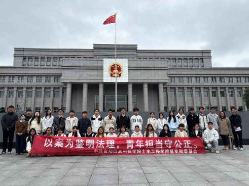 新闻网讯(供图 供稿 土木工程学院姜波 张鹏)为深化青年师生党员法治理念,筑牢司法公正与生命敬畏的信仰。2025年10月22日上午,贵阳信息科技学院土木工程学院党总支组织师生党员代表赴贵州省高级人民法院,开展“以案为鉴明法理,青年担当守公正”案件庭审旁听主题党日活动,通过“沉浸式”旁听涉嫌故意杀人罪二审案件,“零距离”感受司法威严,为青年党员上了一堂直击心灵的法治实践课。学生工作处副处长郭梦轩携土木工程学院5名辅导员一同旁听。
