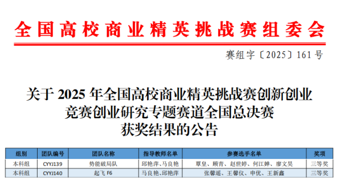 新闻网讯(供稿/供图 经济管理学院)近日,全国高校商业精英挑战赛组委会正式公布2025年全国高校商业精英挑战赛创新创业竞赛创业研究专题赛道全国总决赛获奖结果。我校经济管理学院两支参赛团队凭借出色的研究能力和创新水平,双双荣获全国三等奖,充分展现了我校在创新创业教育与实践育人方面的扎实成效。