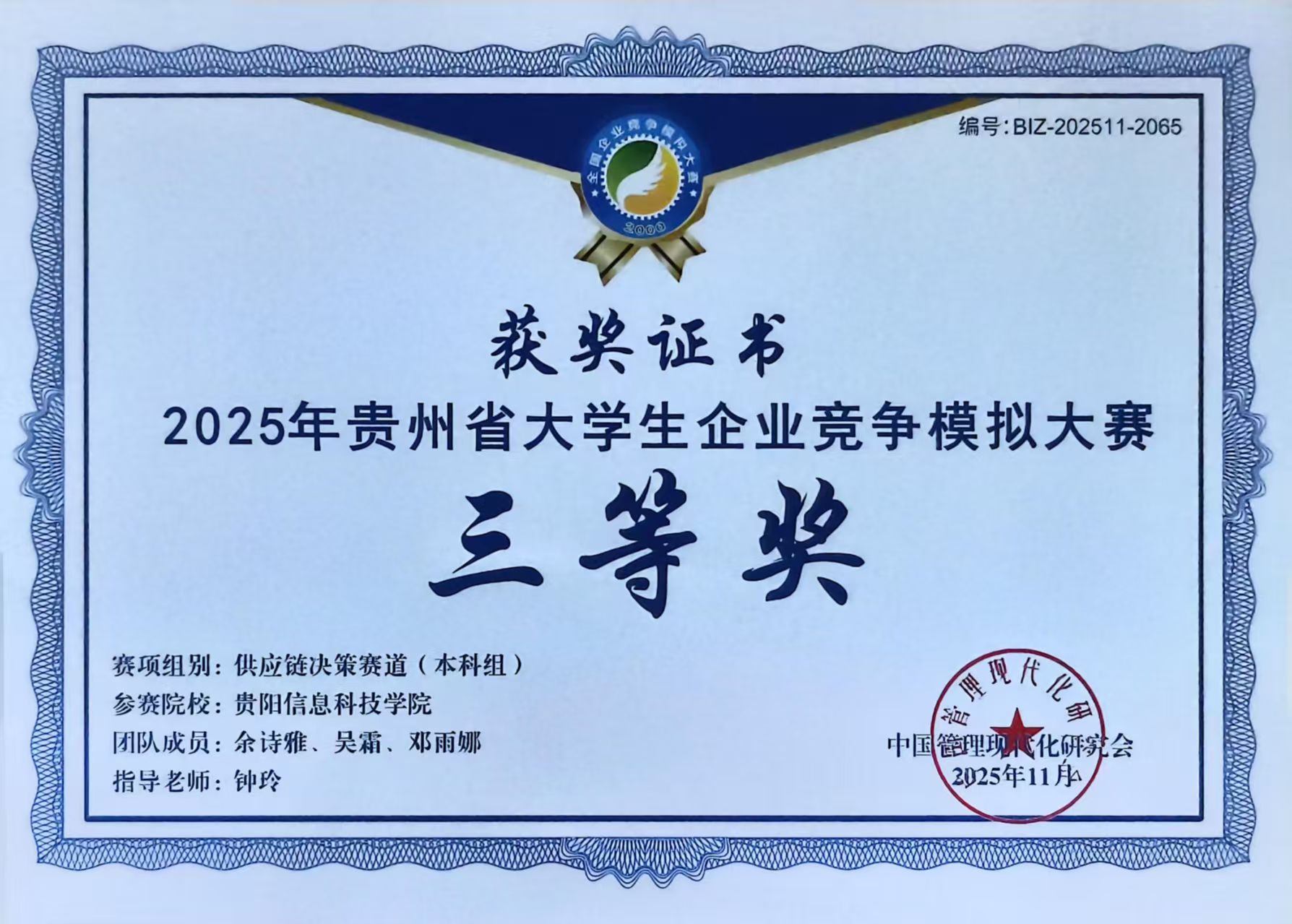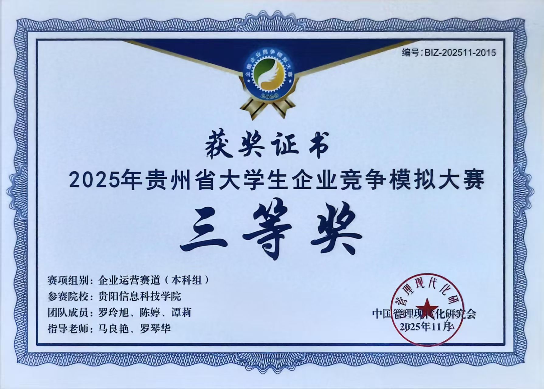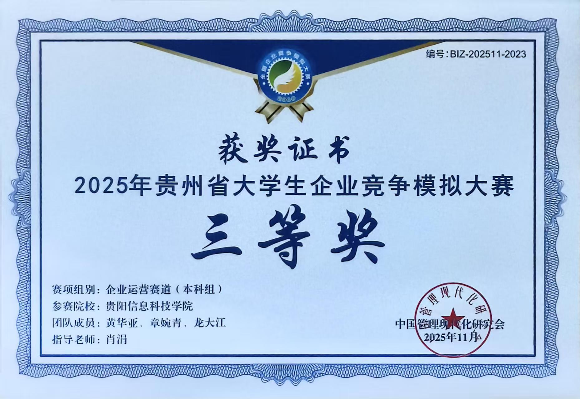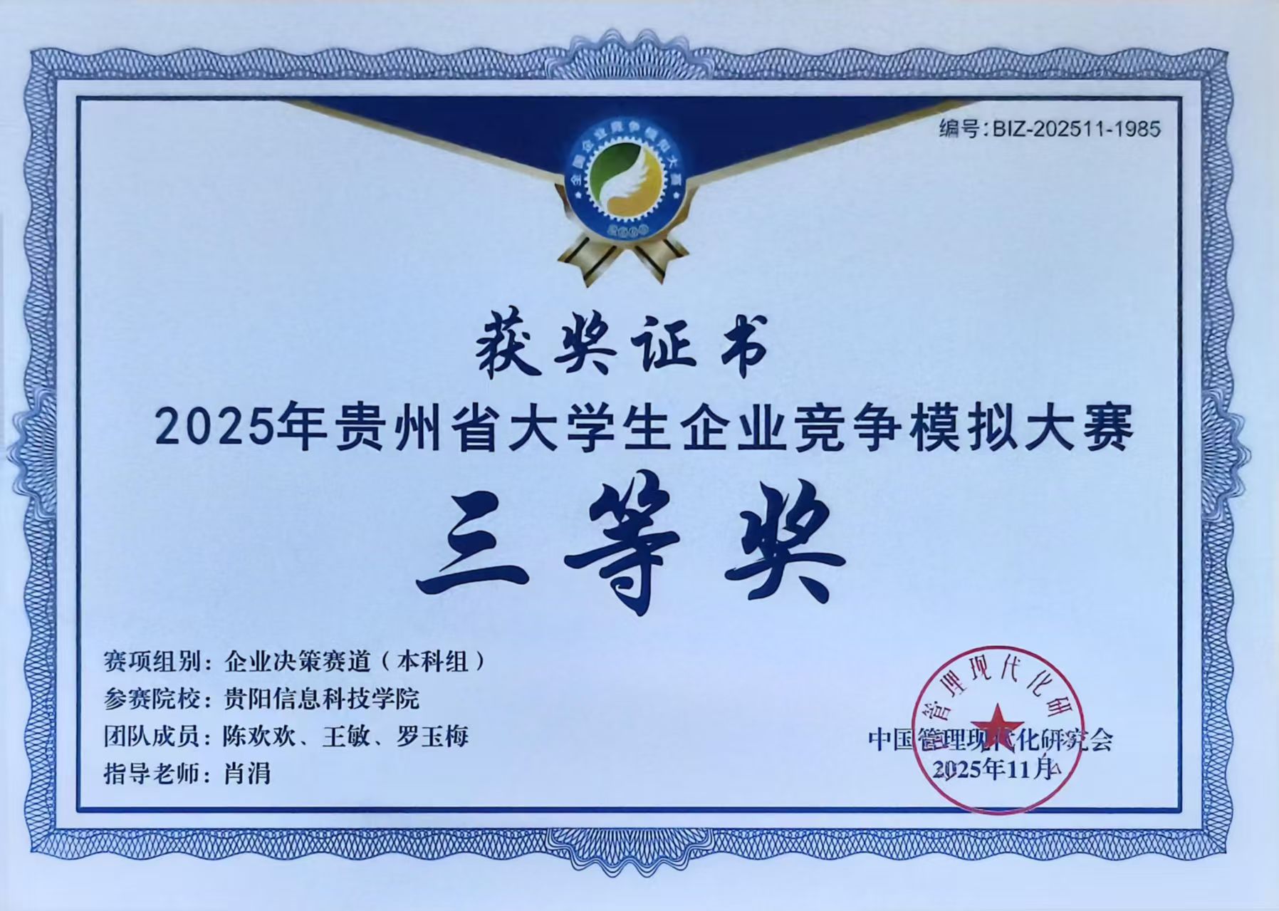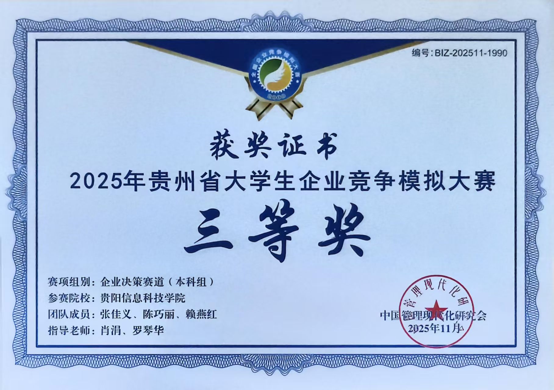 新闻网讯(供稿/供图 经济管理学院)2025年11月28日,2025年贵州省高校企业竞争模拟大赛决赛结果正式揭晓。贵阳信息科技学院经济管理学院参赛学子凭借扎实的专业知识、出色的分析决策能力和高效的团队协作精神,在全省多所高校优秀团队的激烈竞争中脱颖而出,五支参赛队伍全部荣获省级三等奖,充分展现了学校在应用型人才培养与实践教学方面的扎实成效。