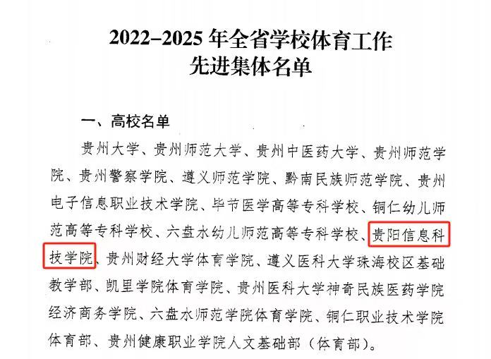近日,贵州省教育厅、贵州省体育局联合下发《关于对2022—2025年全省学校体育工作先进集体和先进个人进行表扬的通报》(以下简称《通报》),对在全省学校体育工作中做出突出贡献的集体与个人予以通报表扬。我校公共教学部体育教研室凭借扎实的教学工作、优异的竞赛成绩和突出的育人成效,荣获“2022—2025年全省学校体育工作先进集体”称号,跻身全省57个受表彰的先进集体之列。