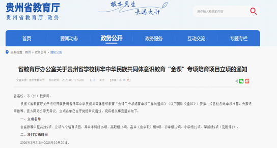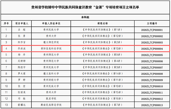 近日,省教育厅组织专家对各地各校申报的贵州省铸牢中华民族共同体意识教育 “金课” 专项培育项目进行评审,确定了拟立项名单。我校乔洪波教师团队成功立项。