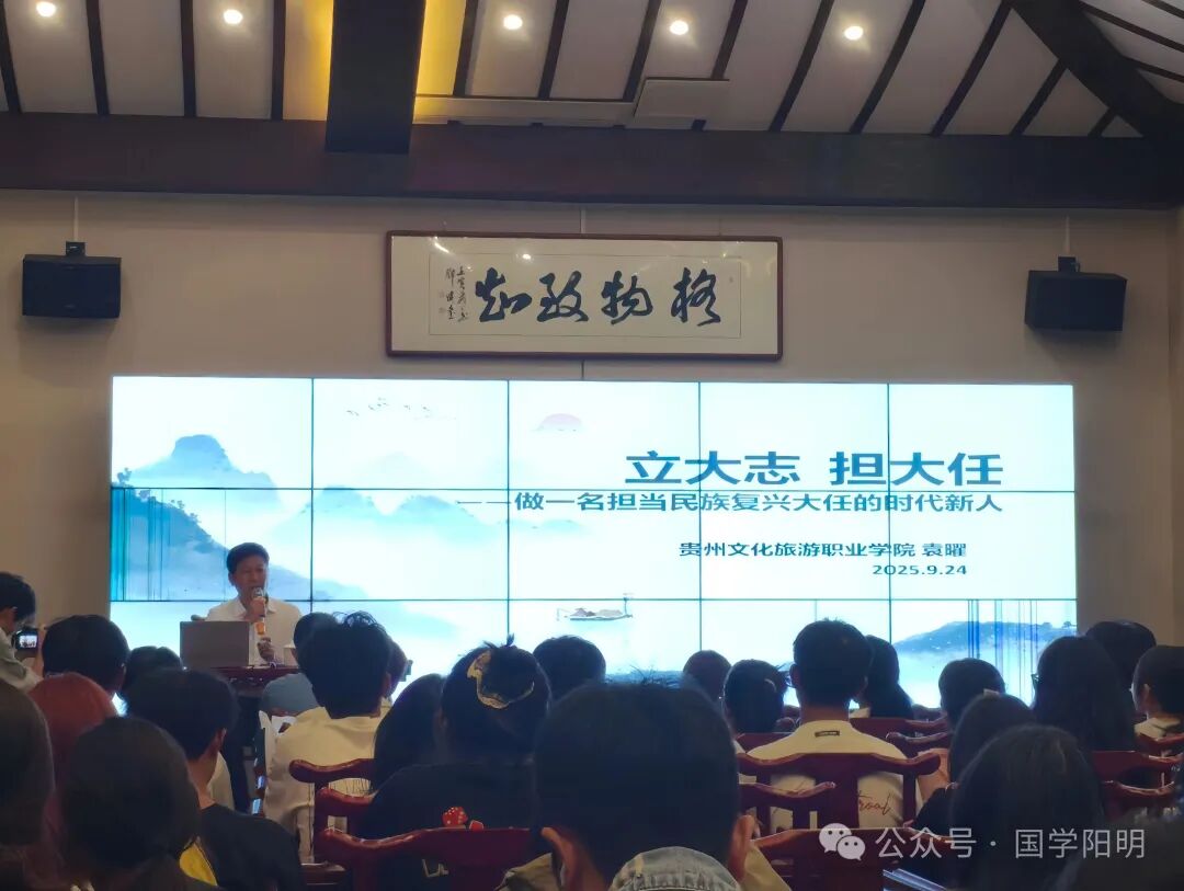 9月24日,“立大志,担大任”专题讲座在阳明书院心学馆举行。本次讲座特邀贵州文化旅游职业学院副院长、中国教育发展战略学会传统文化教育专委会学术委员、中华同心温暖工程基金会知行合一公益大使、贵州省儒学会常务理事袁曜担任主讲。袁曜为师生讲授个人与时代发展的辩证关系,呼吁学子“立大志、担大任”,以阳明心学锤炼精神,践行“知行合一”。120名师生现场聆听,共启精神之旅。