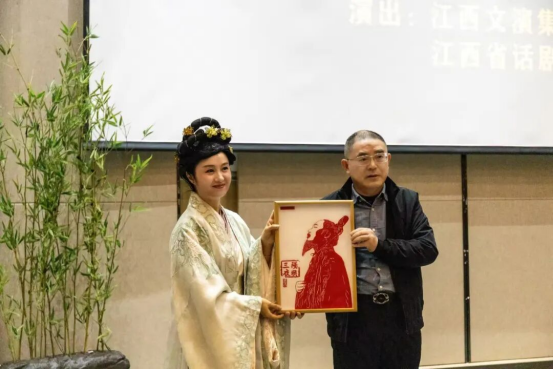 校长唐建荣在致辞中对江西省话剧团的到来表示欢迎与感谢,他指出《阳明三夜》是一堂思想性、艺术性、教育性兼具的思政大课,王阳明“知行合一”的思想与学校校训及教育理念高度契合,希望同学们以观演为契机,将其智慧内化于心、外化于行,在求知与成长中锤炼品格。随后,他代表学校向话剧团赠送了学校非遗剪纸工作室制作的《阳明三夜》剪纸纪念品。