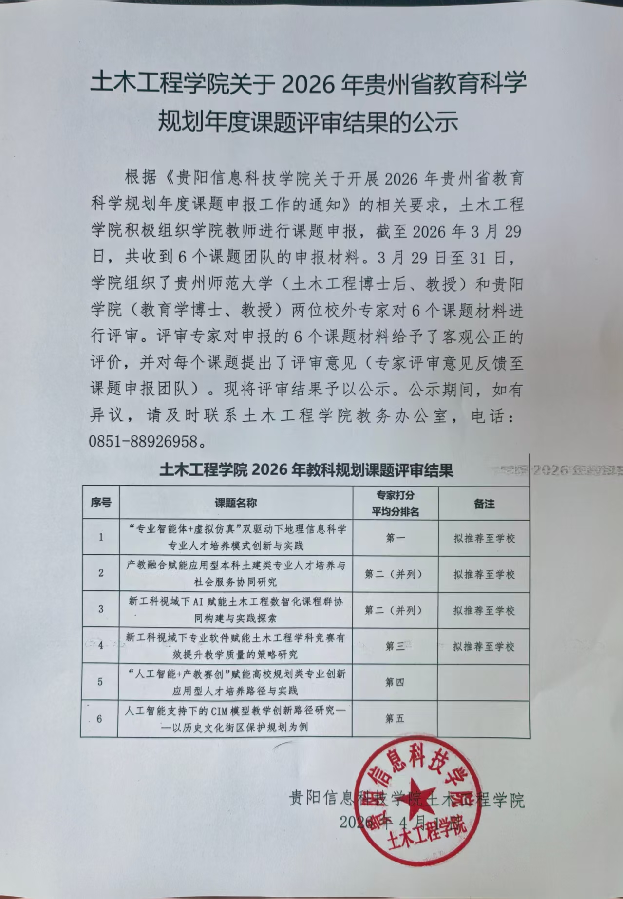 土木工程学院关于2026年贵州省教育科学规划年度课题评审结果的公示