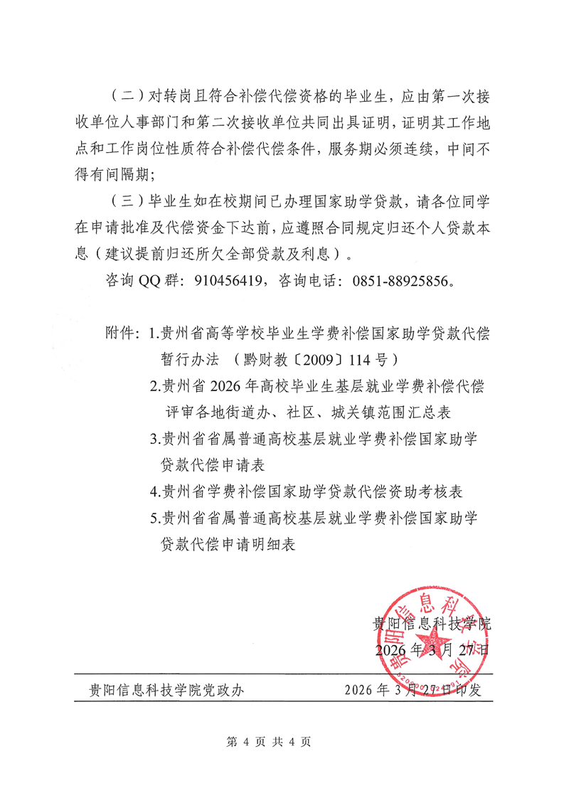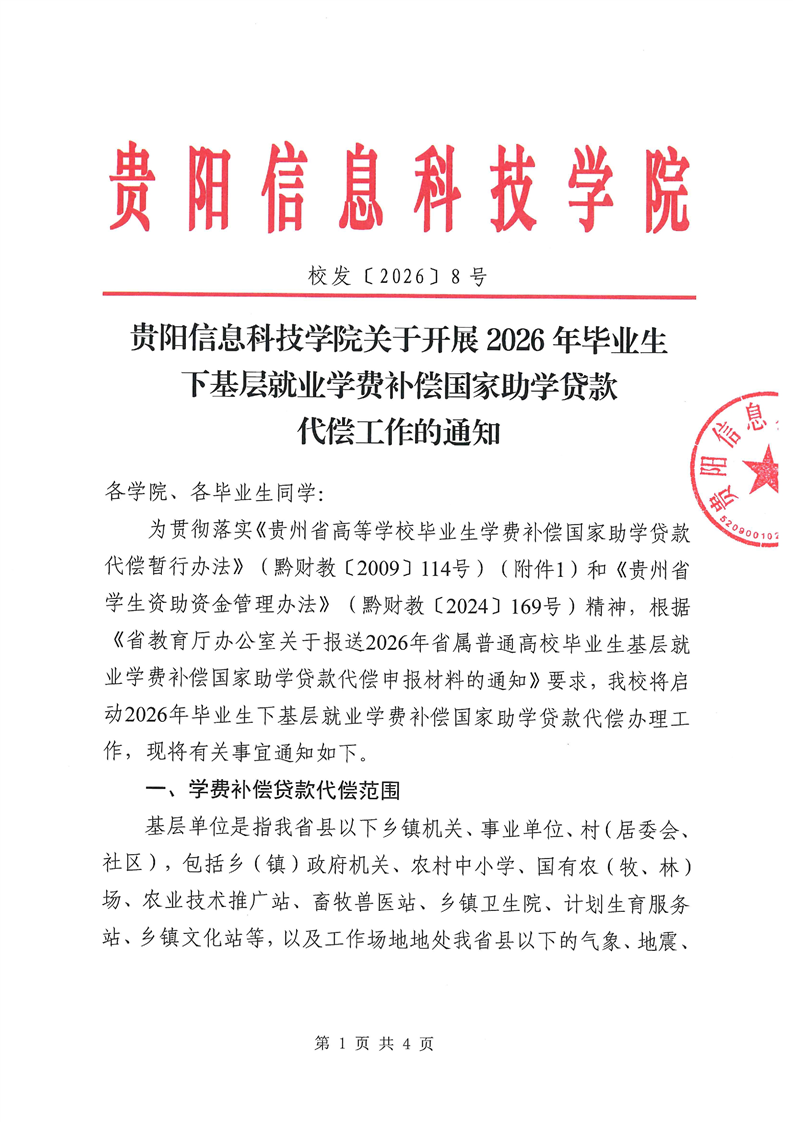 贵阳信息科技学院关于开展2026年毕业生下基层就业学费补偿国家助学贷款代偿工作的通知 2026-03-31 校发〔2026〕8号-附件1- 贵州省高等学校毕业生学费补偿国家助学贷款代偿暂行办法 黔财教〔2009〕114号.pdf 校发〔2026〕8号-附件2_贵州省2026年高校毕业生基层就业学费补偿代偿评审各地街道办、社区、城关镇范围汇总表.xls 校发〔2026〕8号-附件3_贵州省省属普通高校基层就业学费补偿国家助学贷款代偿申请表.xls 校发〔2026〕8号-附件4-贵州省学费补偿国家助学贷款代偿资助考核表.xls 校发〔2026〕8号-附件5_贵州省省属普通高校基层就业学费补偿国家助学贷款代偿申请明细表.xls 校发〔2026〕8号-贵阳信息科技学院关于开展2026年毕业生下基层就业学费补偿国家助学贷款代偿工作的通知-盖章.pdf