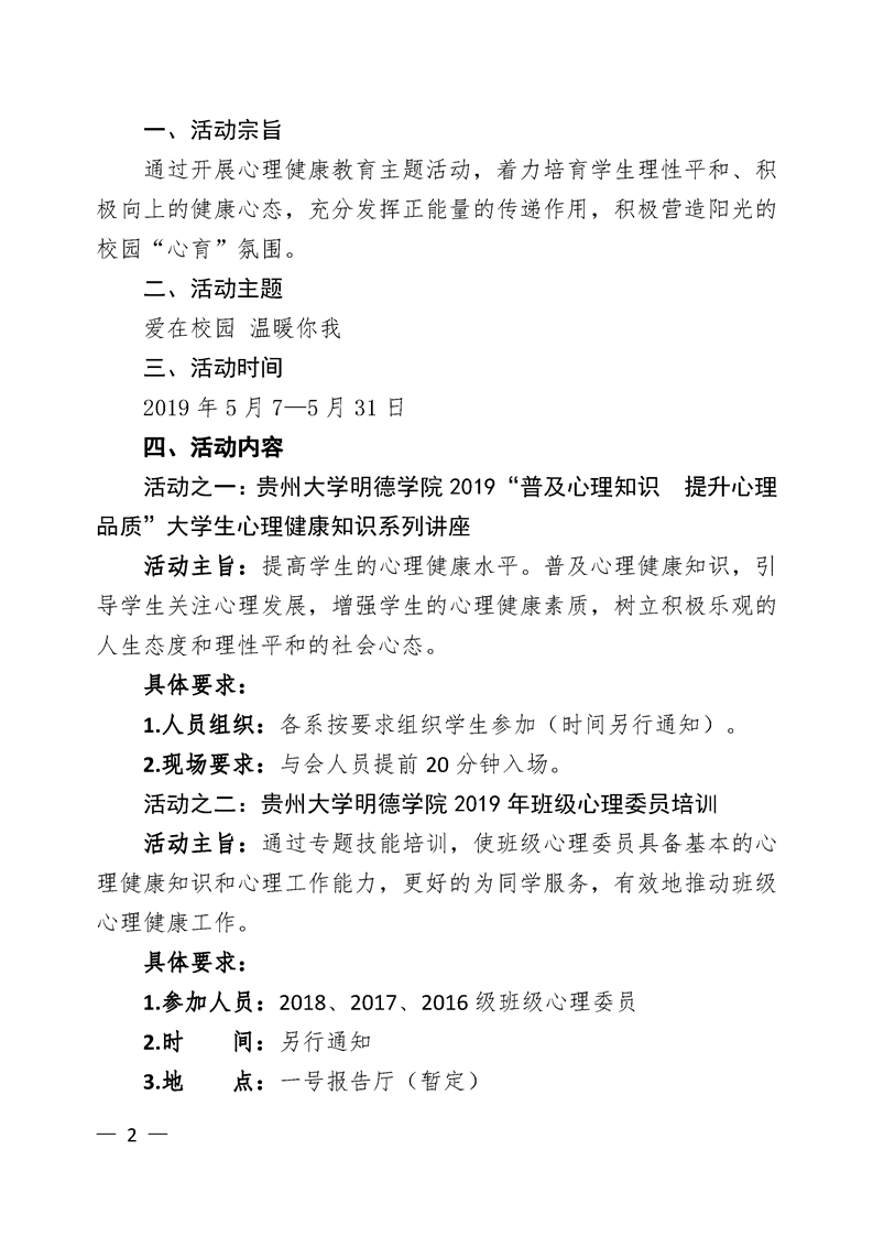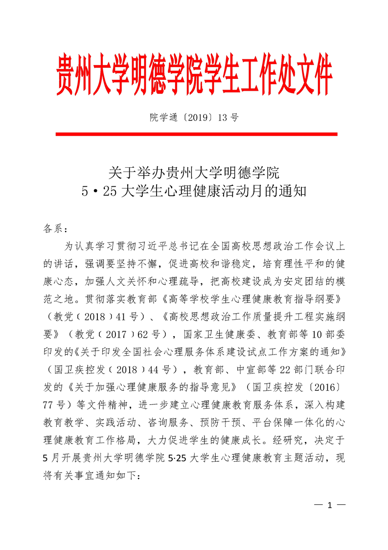 关于举办贵州大学明德学院5·25大学生心理健康活动月的通知