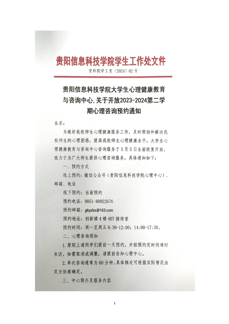 贵阳信息科技学院2023-2024第二学期心理中心开放咨询预约通