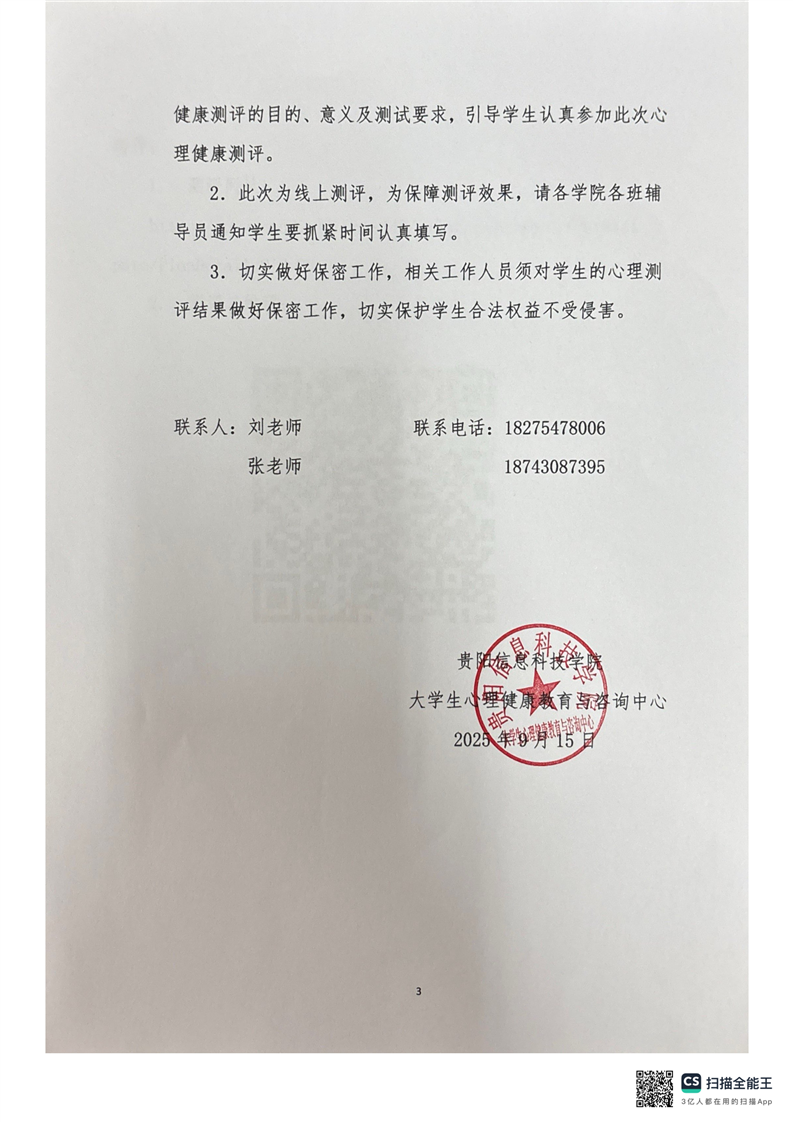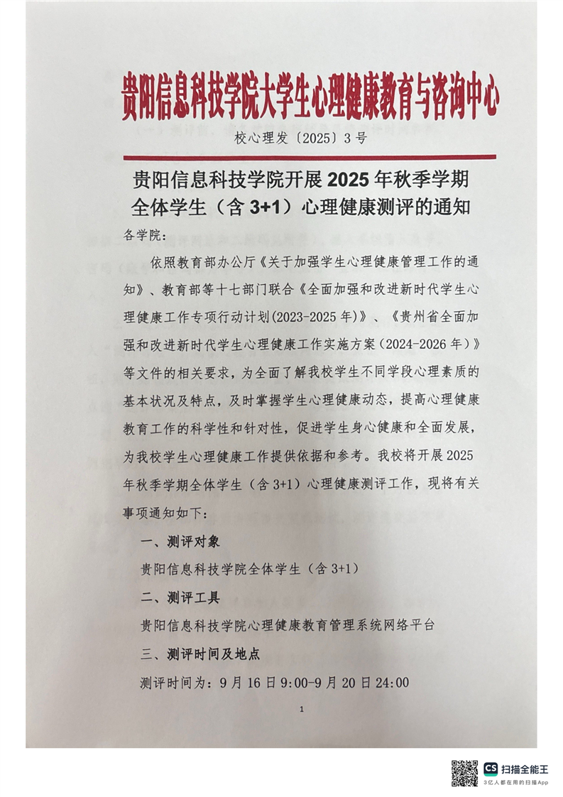 贵阳信息科技学院开展2025秋季学期全体学生(含3+1)心理健康测评的通知
