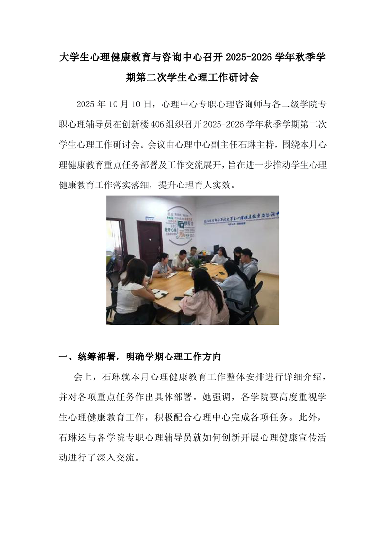 大学生心理健康教育与咨询中心召开2025-2026学年秋季学期第二次学生心理工作研讨会