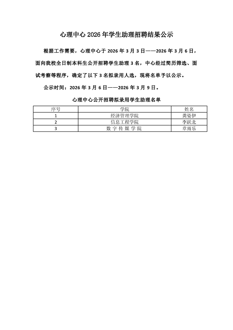 心理中心2026年学生助理招聘结果公示