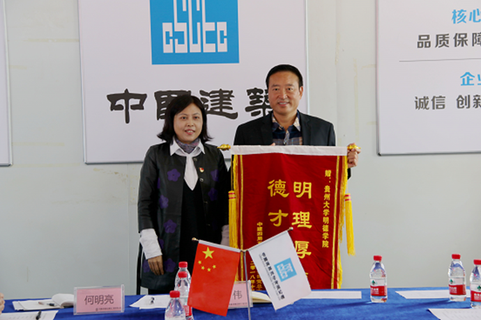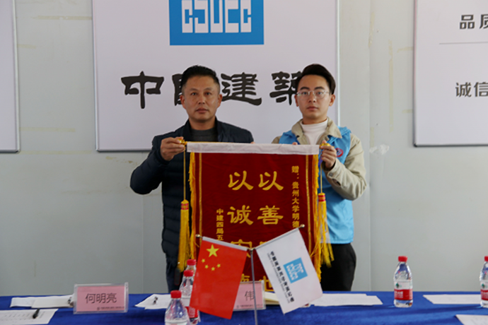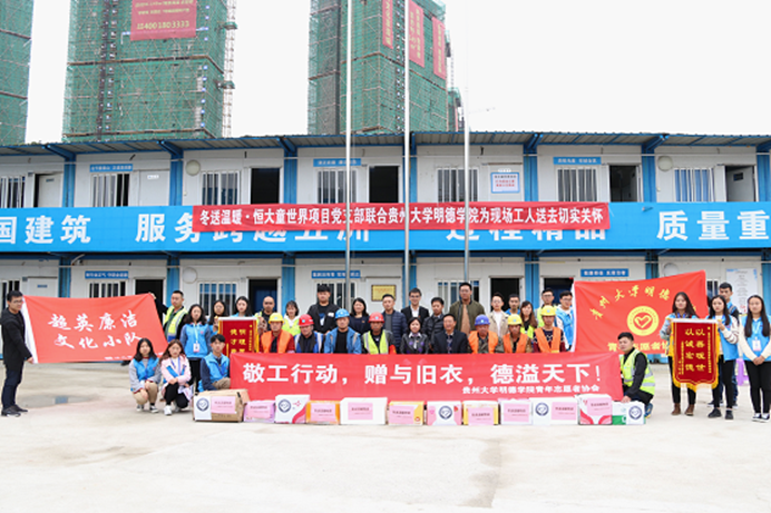 金明辉书记发言讲到:重阳佳节工友们的努力奉献精神很值得我们明德学子去学习,本次以“青协牵头,团委参与”的送暖活动是明德学院广大师生的心理体现,通过合作推动共同发展,有利于高校党建工作的顺利进行。随后,叶烈书记结合去年的活动,在“党建、生产、科研、人才”等更多领域提出殷切希望——与贵州大学明德学院以及青年志愿者协会能有更广泛的合作。活动中,项目指挥长田发军向青年志愿者协会授予锦旗,叶烈书记向贵州大学明德学院授予锦旗,出席嘉宾依次为工友代表发放爱心冬衣。最后,参与活动人员合影留念,活动取得圆满结束。