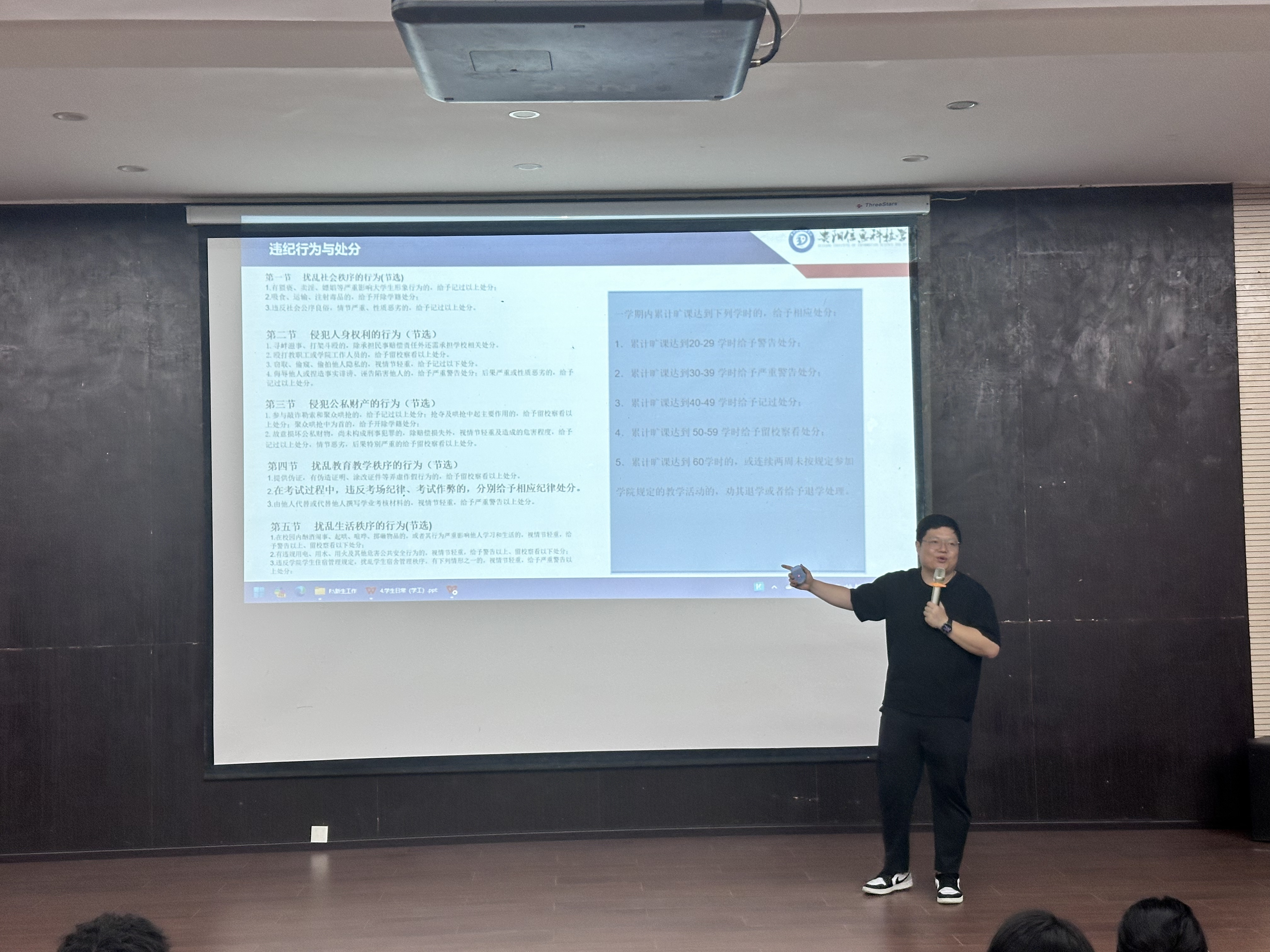 学业是大学的核心,规划是成长的前提。在随后的学业指导环节,学工办主任郭东越老师围绕《学生日常(学工)》《贵阳信息科技学院全日制本科生学士学位授予实施办法》等内容展开专题讲解。他从学生日常管理规范、严格的学业考核要求,到清晰的学士学位授予条件,逐一为新生们厘清大学学业的“边界”与“路径”,让新生们明确了大学学习的目标与方向,为后续投入专业学习做好了充分的认知准备。