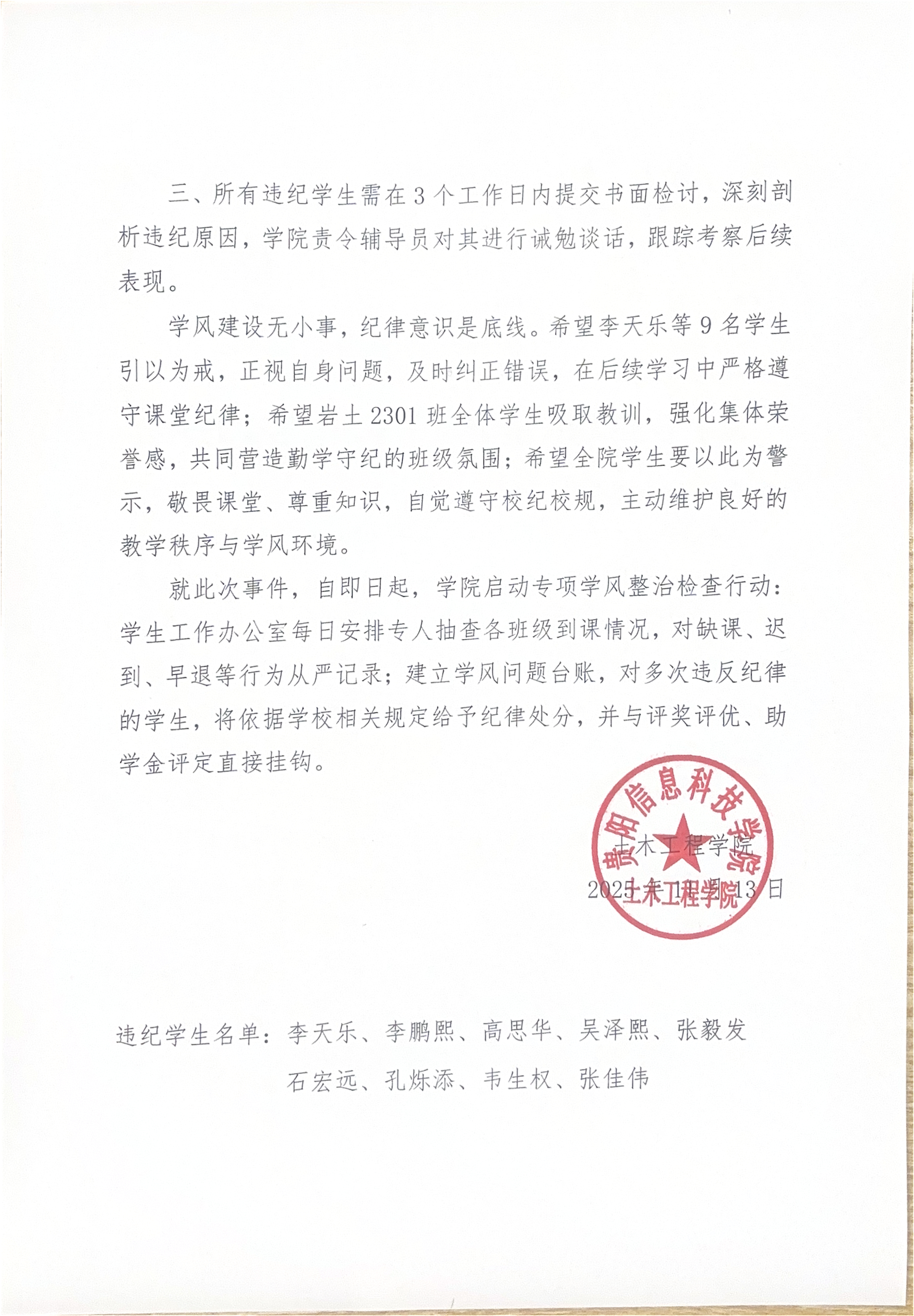贵阳信息科技学院土木工程学院关于岩土2301班李天乐等9名学生的通报