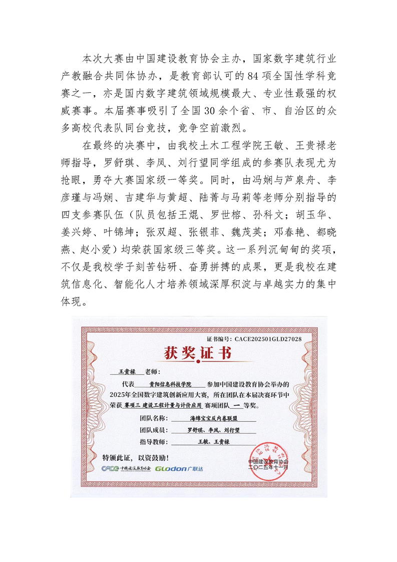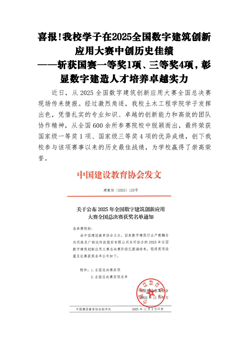 喜报!我校学子在2025全国数字建筑创新应用大赛中创历史佳绩 ——斩获国赛一等奖1项、三等奖4项,彰显数字建造人才培养卓越实力