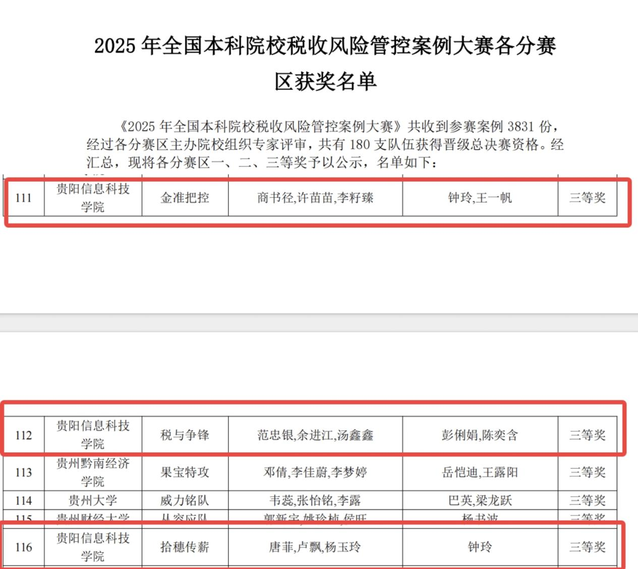 新闻网讯(供稿/供图 宋大群)2025年全国本科院校税收风险管控案例大赛分赛区评审结果近日公布。本次大赛吸引全国本科院校提交参赛案例3831份,经各分赛区专家严格评审,180支队伍晋级总决赛。我校会计专业3支队伍在钟玲、王一帆、彭俐娟、陈奕含等老师指导下,参赛学生凭借扎实专业素养与实践能力,均获贵州赛区三等奖,彰显学校财税专业人才培养成效。