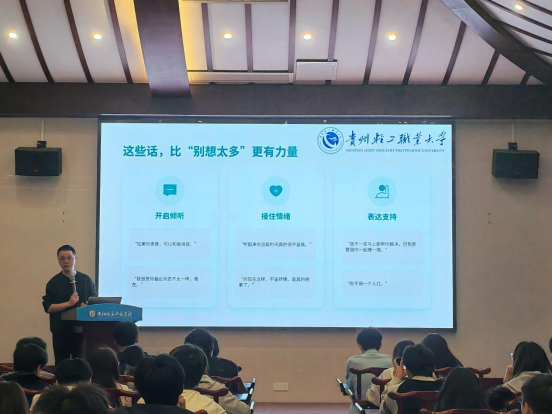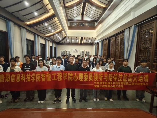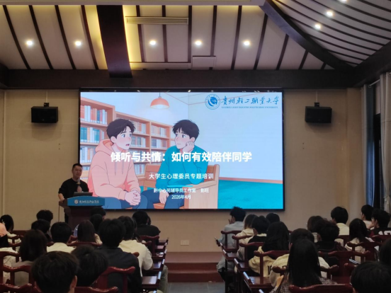 为进一步加强学院心理健康教育工作,提升心理委员朋辈辅导能力,充分发挥心理委员在班级心理健康工作中的“第一道防线”作用,2026年4月16日19:00,贵阳信息科技学院智能工程学院在阳明书院开展了以“倾听与共情:如何有效陪伴同学”为主题的心理委员专题培训讲座。本次讲座特邀贵州轻工职业技术大学“黔中心苑”辅导员工作室主持人彭旺老师主讲,学院全体心理委员参与培训。