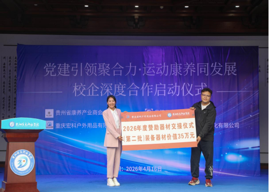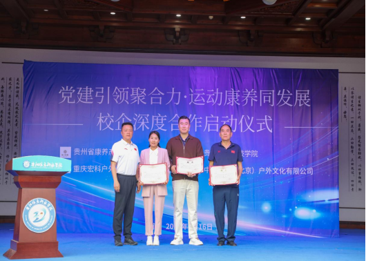 2026 年 4 月 16 日下午,党建引领聚合力・运动康养同发展校企深度合作启动仪式在贵阳信息科技学院阳明书院隆重举行。本次校企合作由贵州省康养产业商会、贵阳信息科技学院、重庆宏科户外用品有限公司、中探巅峰(北京)户外文化有限公司等多家单位共同参与联动,聚焦运动康养、休闲体育、户外救援等重点方向,进一步深化产教融合、校企协同育人,致力于推动学院专业建设与地方产业高质量发展同频共振。