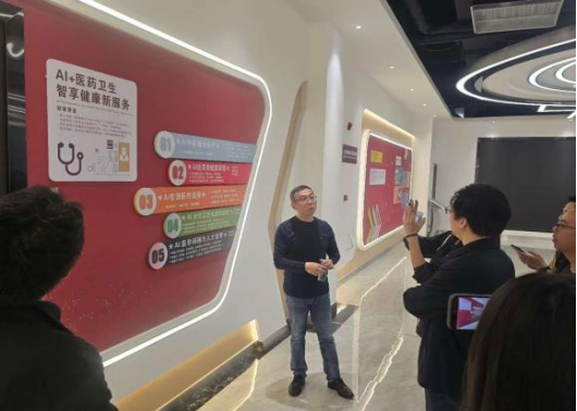 活动伊始,在企业相关负责人的热情接待下,师生一行先后参观了基地AI医疗展厅、智能健康管理服务中心、技术研发实验室等核心功能区域。企业负责人围绕人工智能+健康管理、智能医疗辅助诊断、数字化健康服务、慢性病智能管理、远程健康监护等领域,详细介绍了基地的技术研发成果、落地应用场景及行业发展前景。师生们近距离观摩了AI健康风险评估系统、智能诊疗辅助设备、个性化健康管理服务平台等前沿技术产品,深入了解人工智能技术在全周期健康管理、医疗服务优化、基层健康赋能等方面的实践应用,直观感受到AI技术为传统健康管理与医疗服务行业带来的深刻革新与突破性发展。