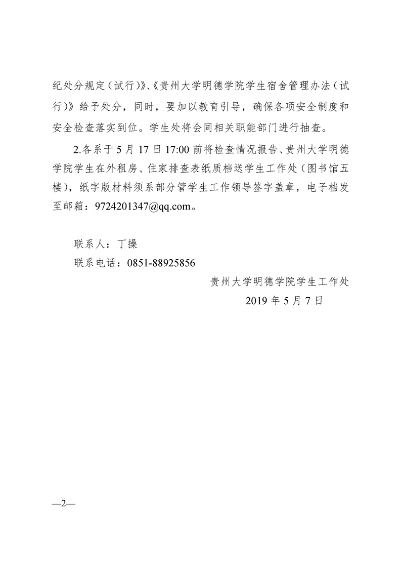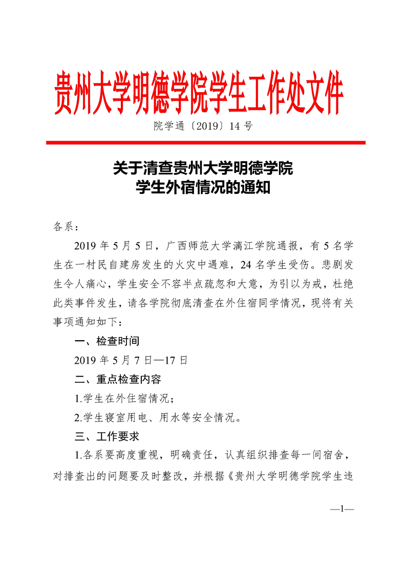 关于清查贵州大学明德学院学生外宿情况的通知