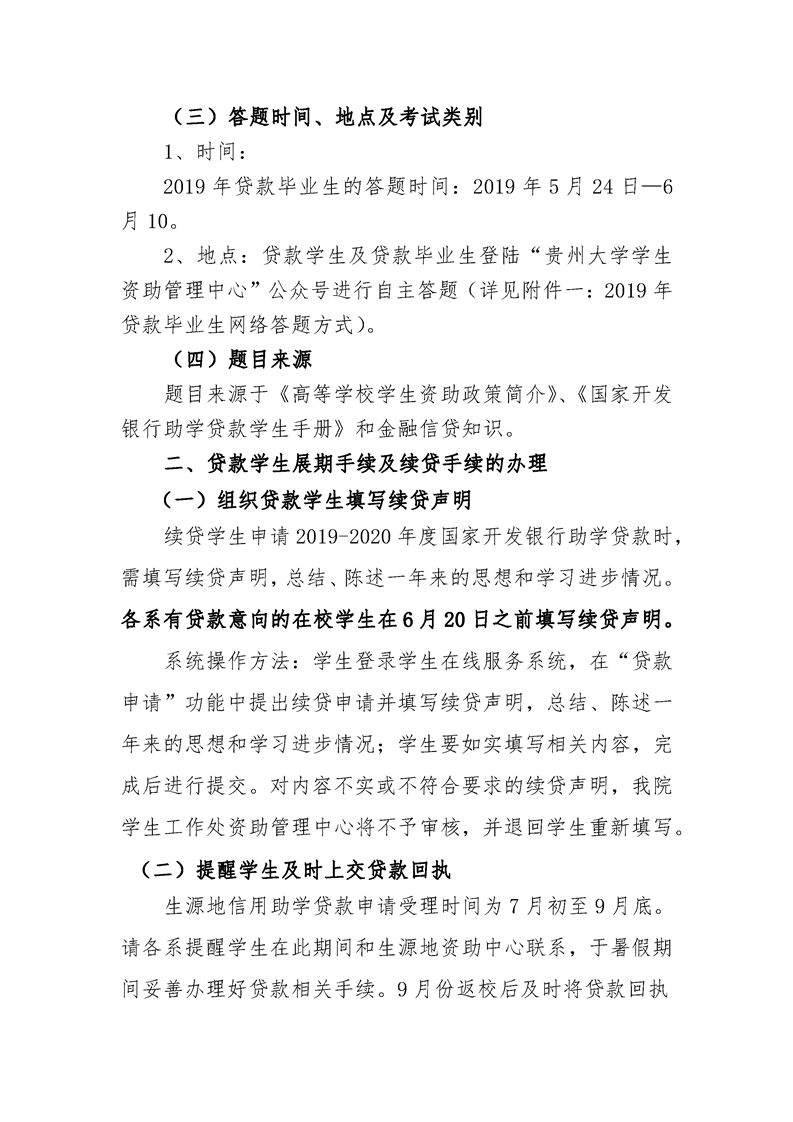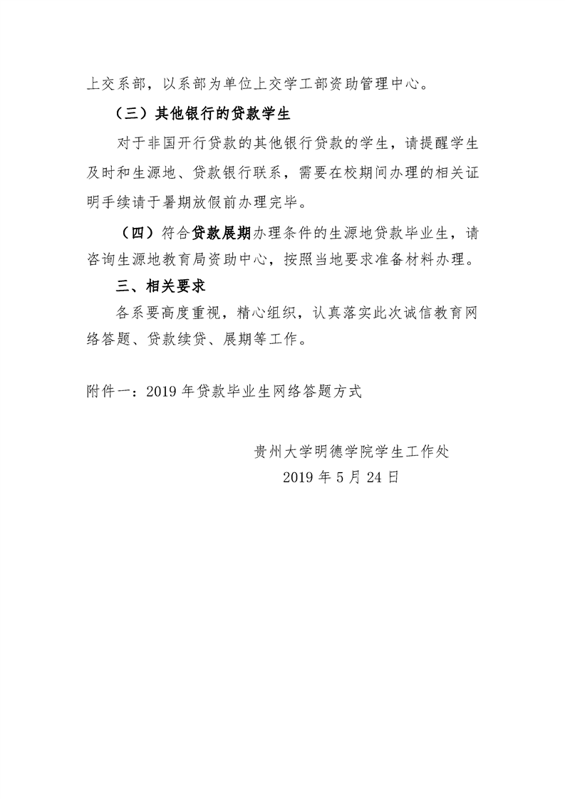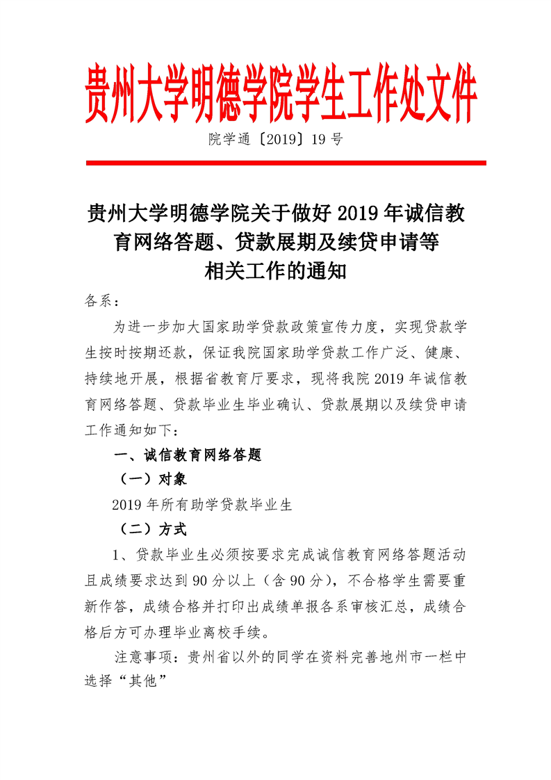 贵州大学明德学院关于做好2019年诚信教育网络答题、贷款展期及续贷申请等相关工作的通知