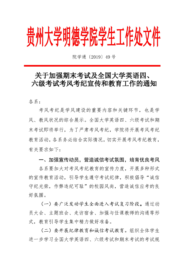 关于加强期末考试及全国大学英语四、六级考试考风考纪宣传和教育工作的通知