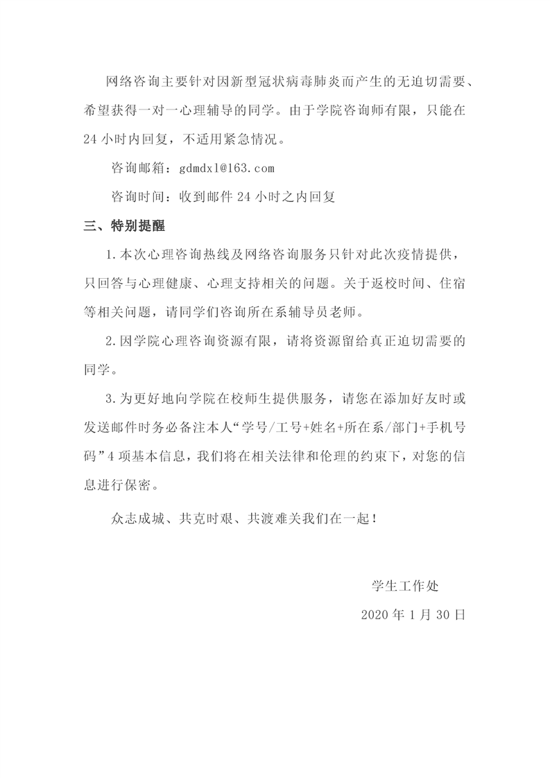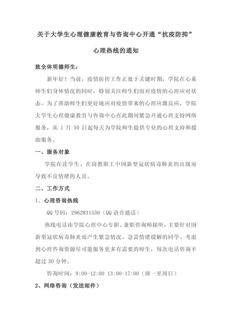关于大学生心理健康教育与咨询中心开通“抗疫防抑” 心理热线的通知
