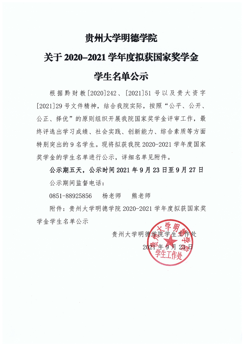贵州大学明德学院关于2020-2021学年度拟获国家奖学金学生名单公示