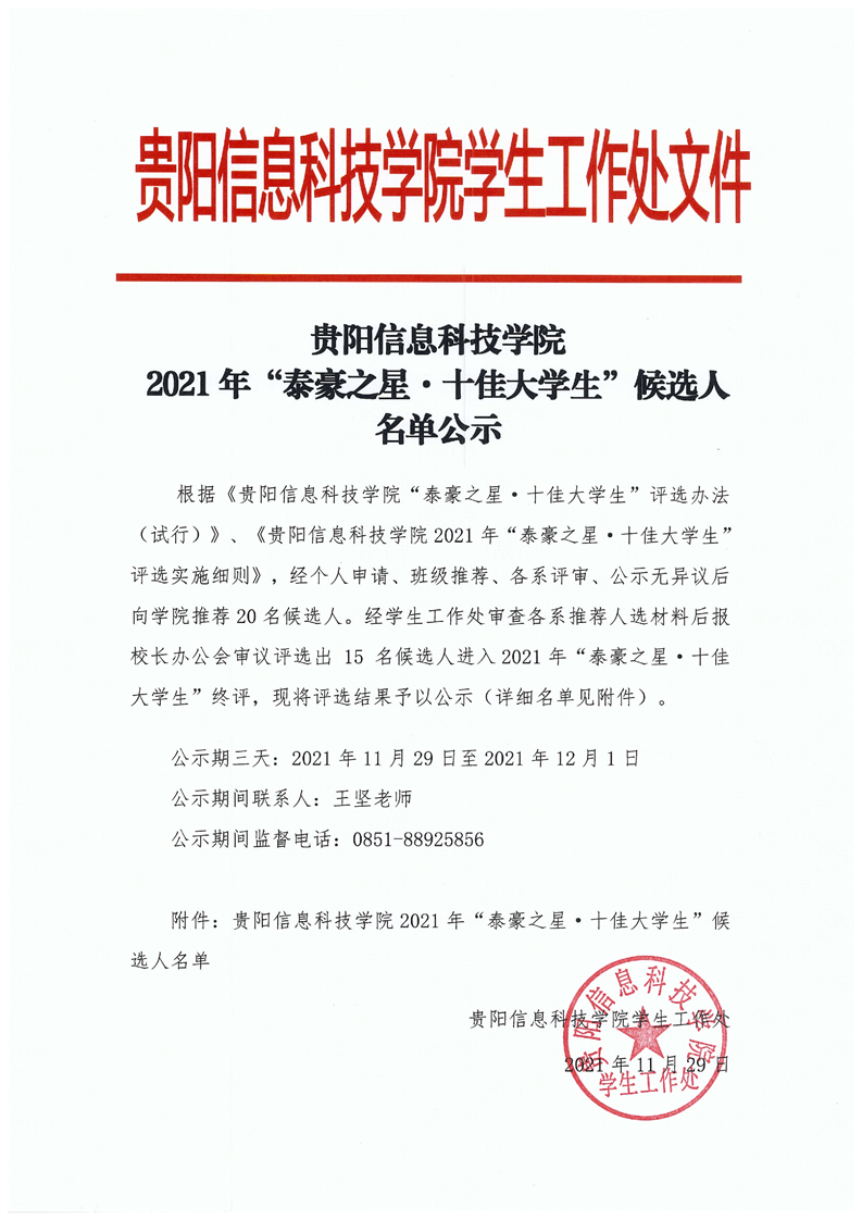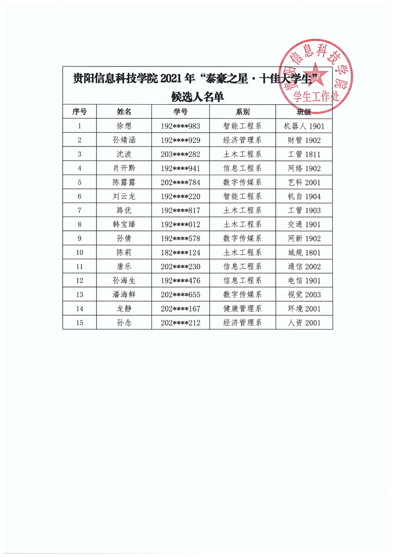 贵阳信息科技学院2021年“泰豪之星·十佳大学生”候选人名单公示
