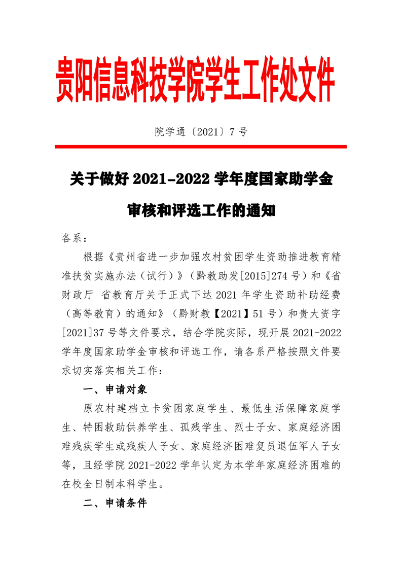 贵阳信息科技学院关于做好2021-2022学年度国家助学金 审核和评选工作的通知