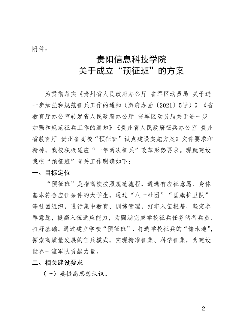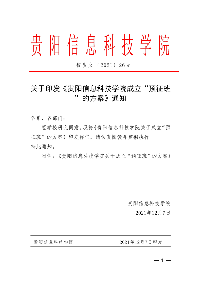 关于印发《贵阳信息科技学院成立“预征班”的方案》通知