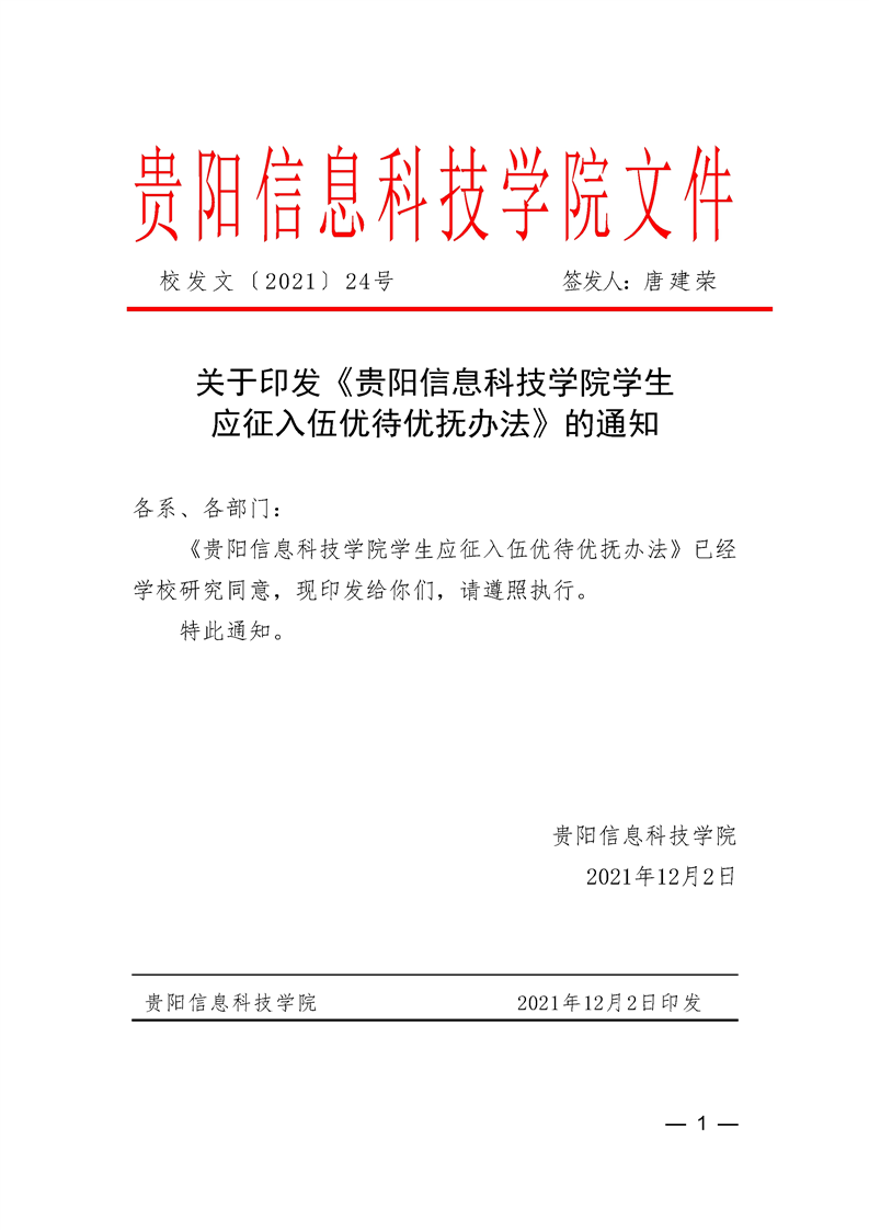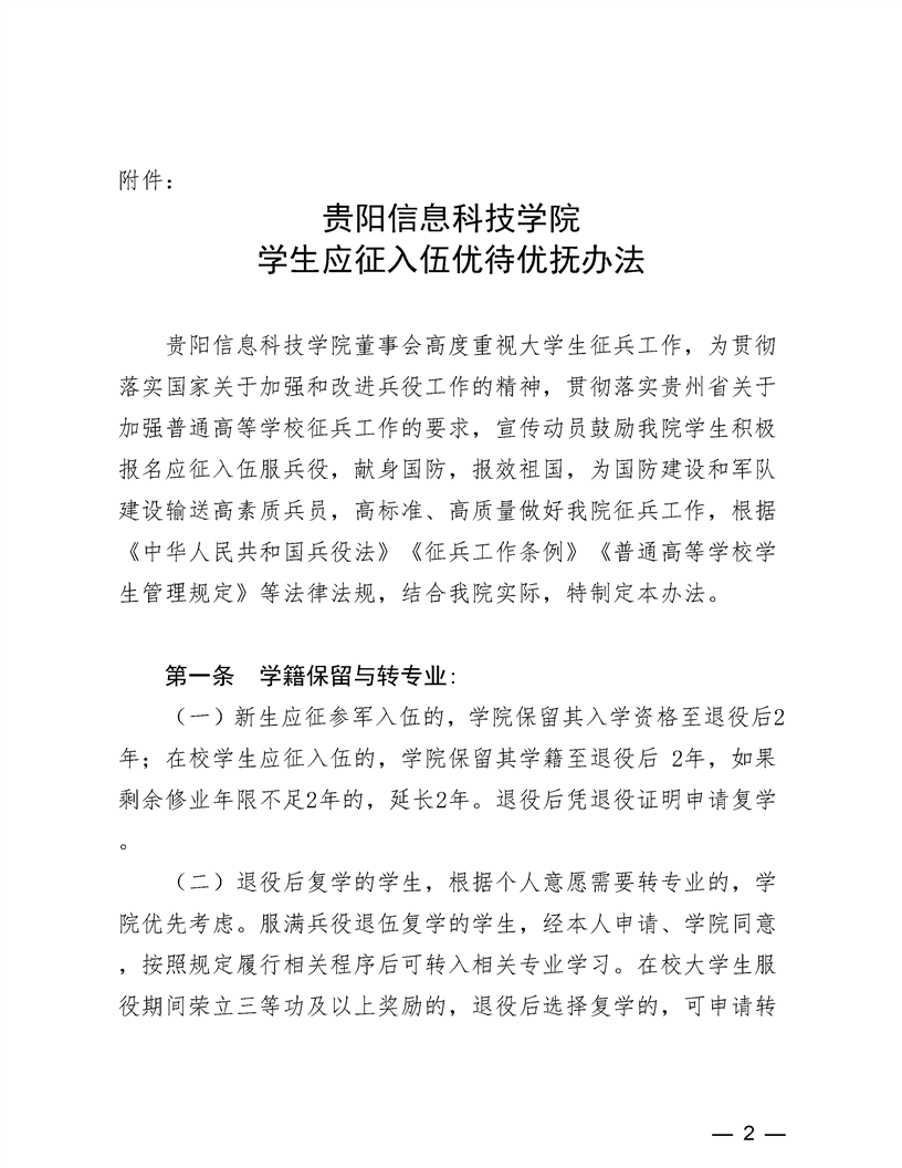 关于印发《贵阳信息科技学应征入伍优待优抚办法》的通知