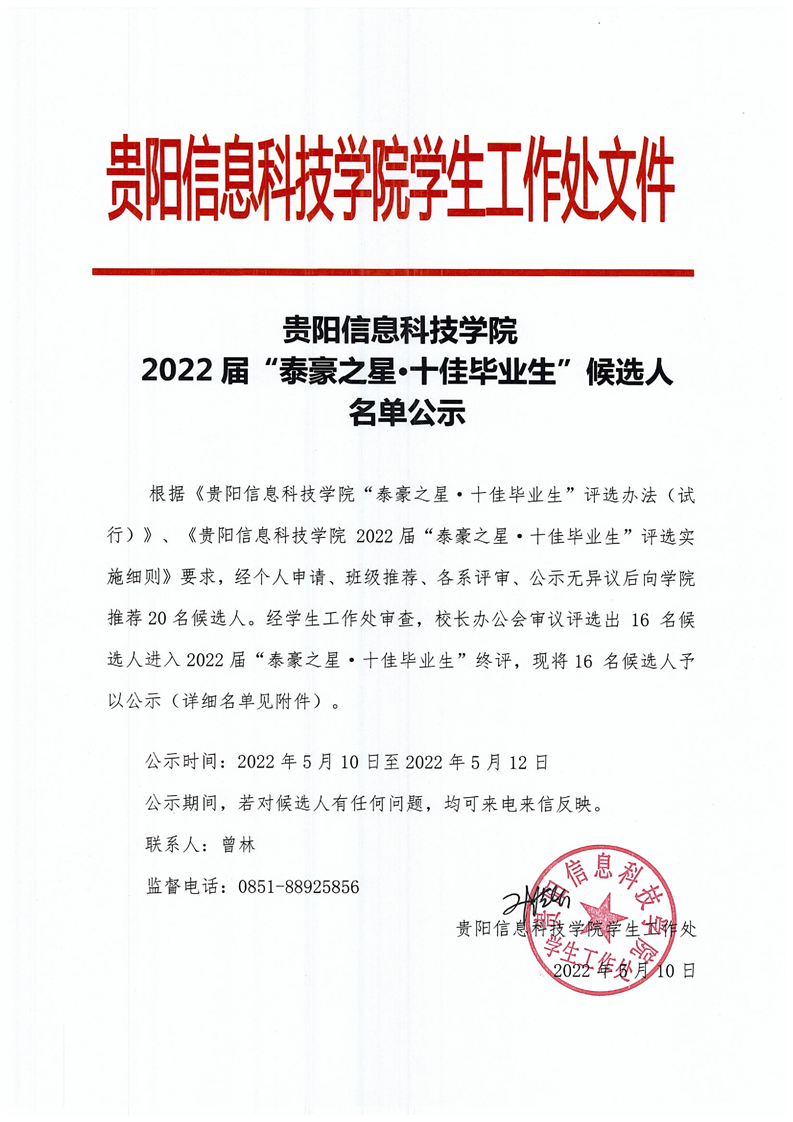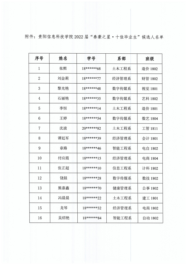 贵阳信息科技学院2022届“泰豪之星·十佳毕业生候选人公示