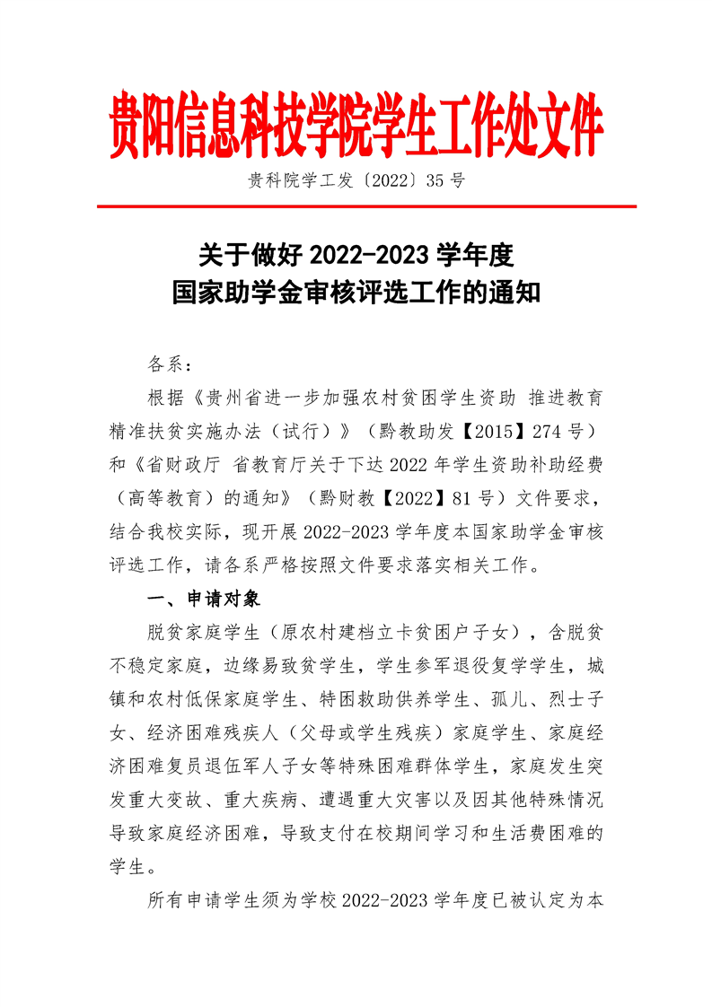 贵阳信息科技学院关于做好2022-2023学年度国家助学金审核评选工作的通知