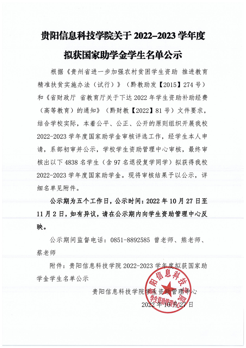 贵阳信息科技学院关于2022-2023学年拟获国家助学金学生名单公示