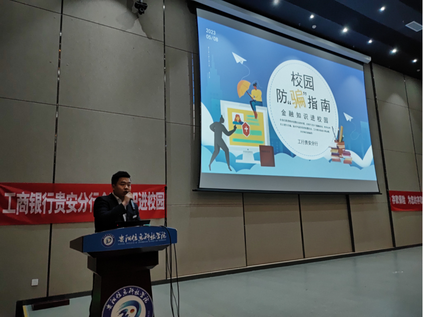 此次讲座邀请中国工商银行贵安支行杨浪老师主讲,旨在向师生介绍当前校园诈骗的常见形式和手段。讲座中,杨浪老师详细讲解了钓鱼网站、校园贷款、网络刷单、招聘和兼职等常见诈骗方式,并针对以上诈骗方式提供防范措施和应对方法。
