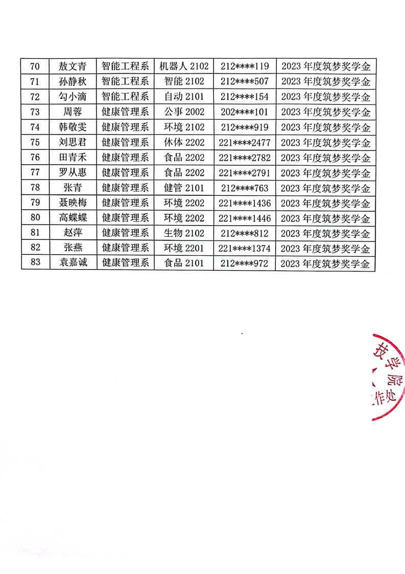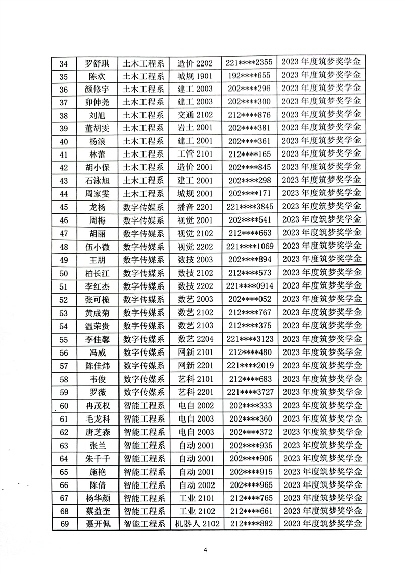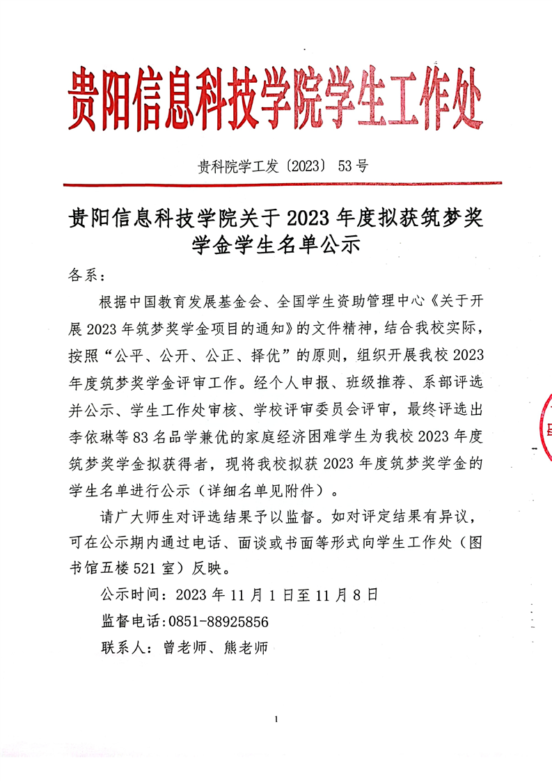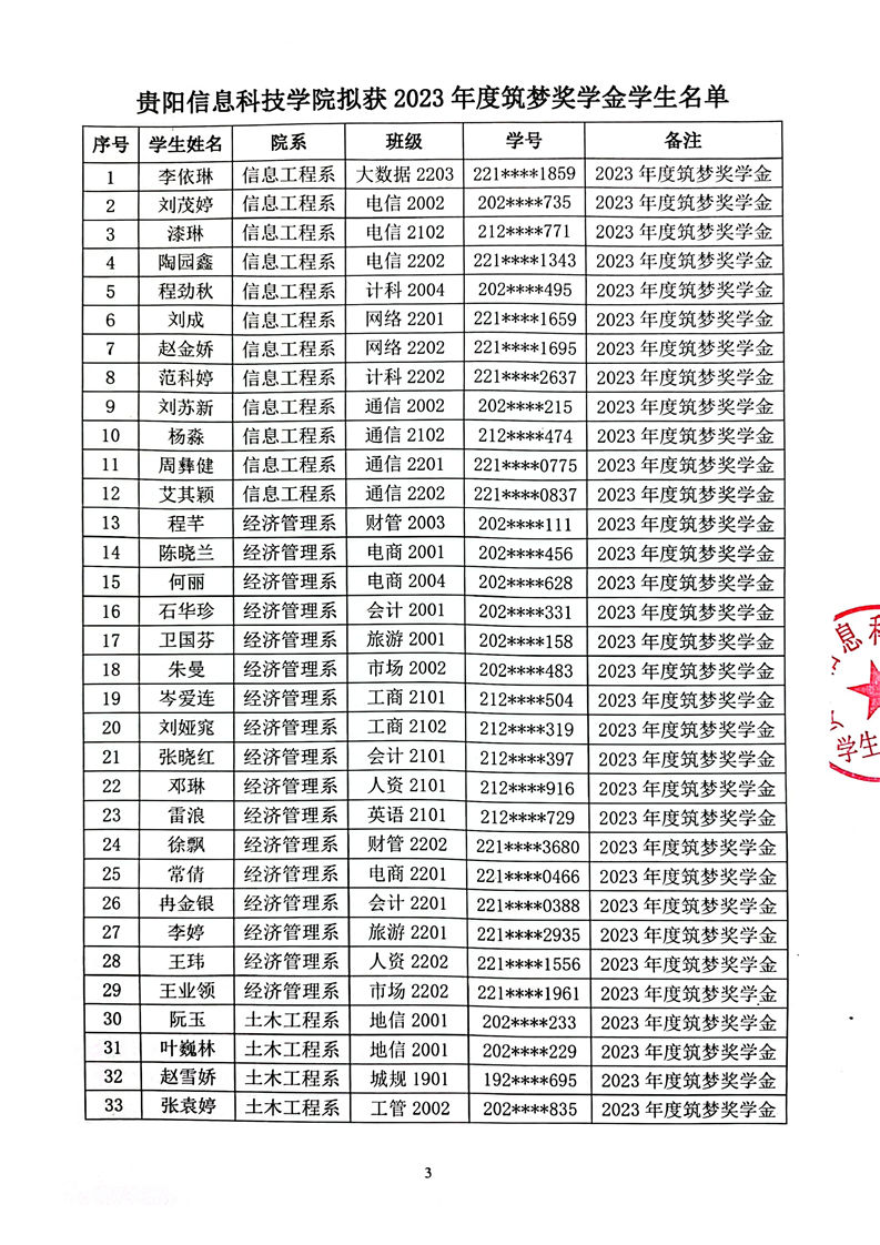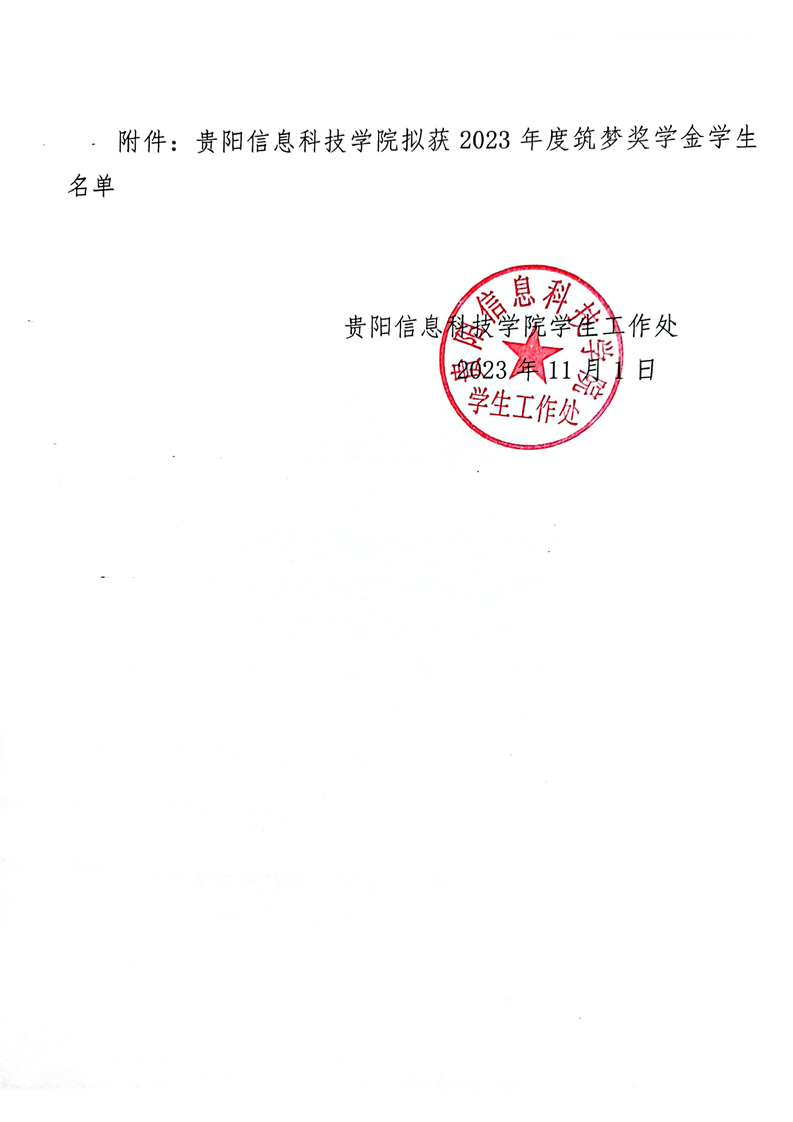 贵阳信息科技学院关于2023年度拟获筑梦奖学金学生名单公示