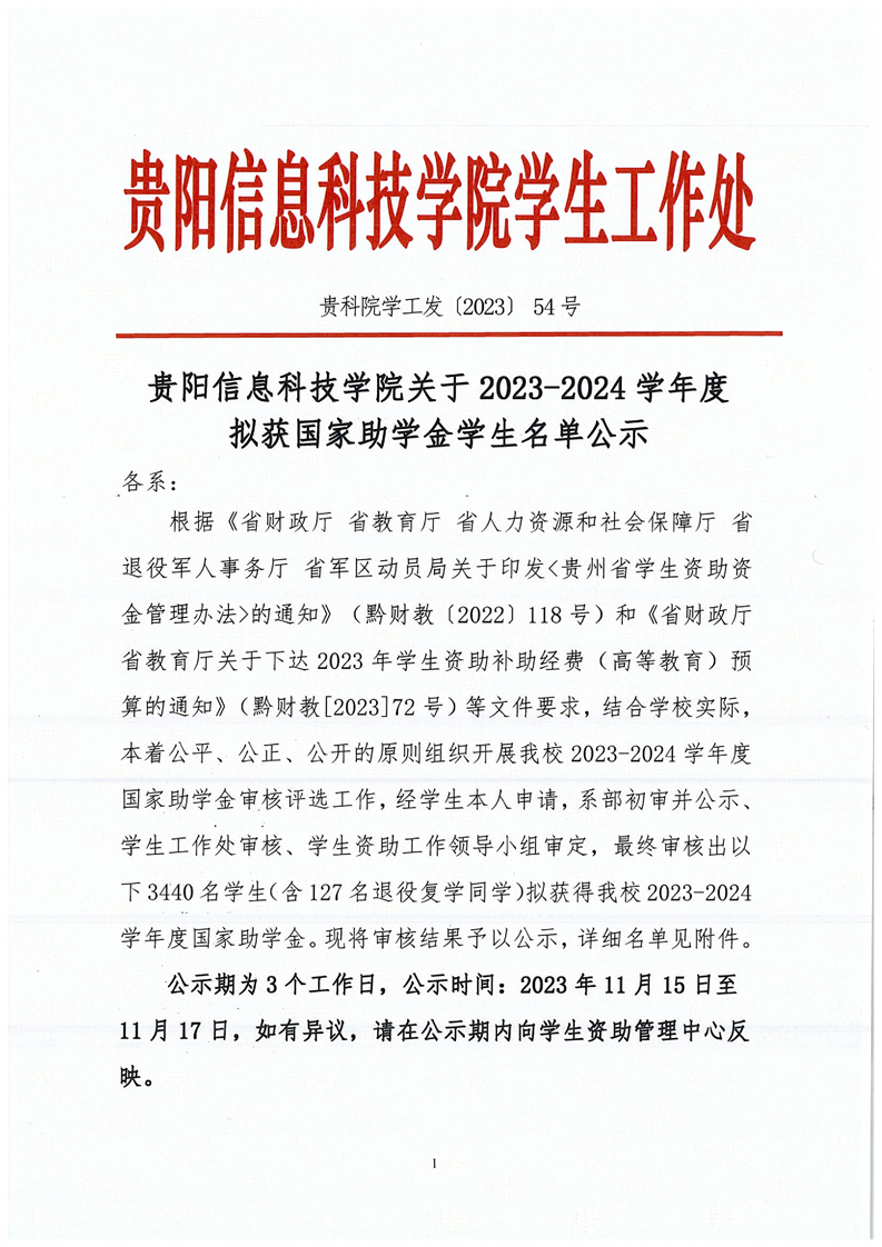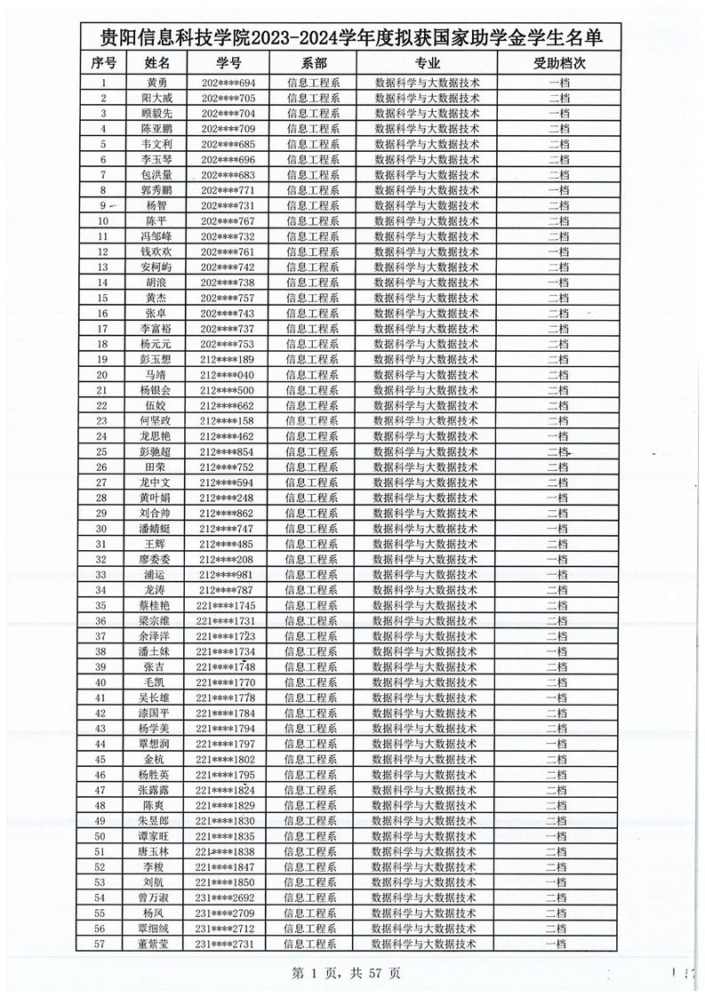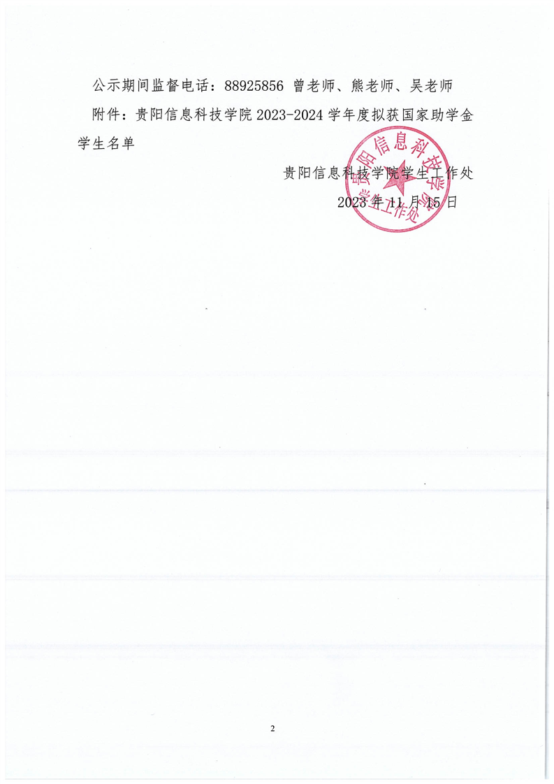 贵阳信息科技学院关于2022-2023学年拟获国家助学金学生名单公示