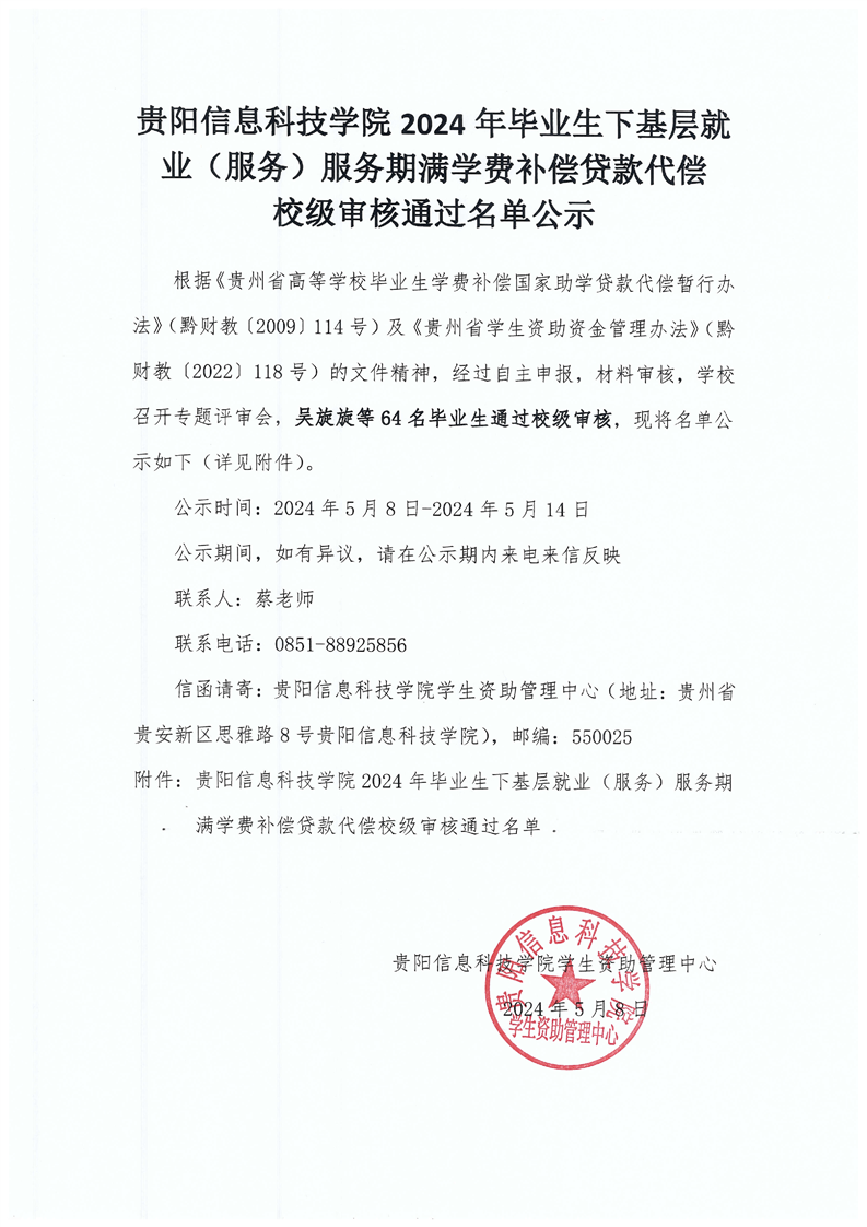 贵阳信息科技学院2024年毕业生下基层就业(服务)服务期满学费补偿贷款代偿校级审核通过名单公示