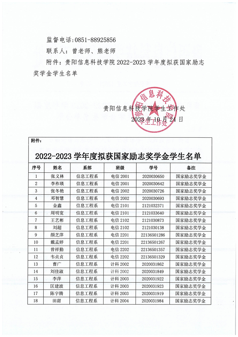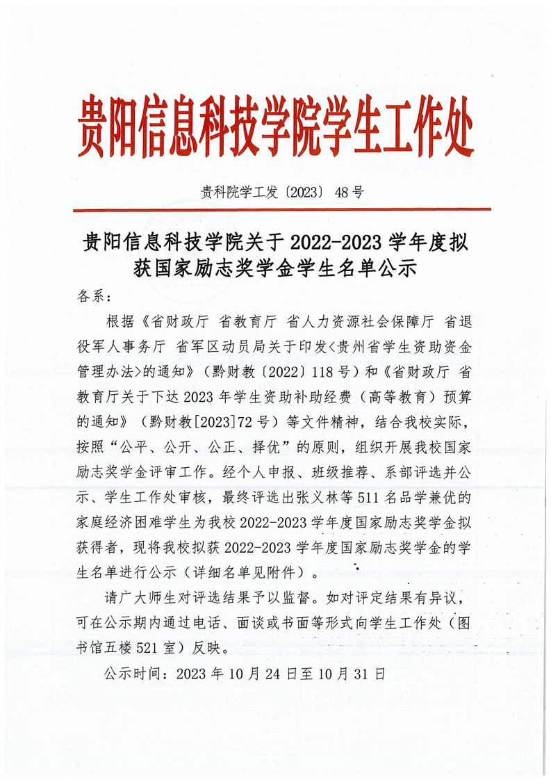 关于贵阳信息科技学院2022-2023学年度拟获国家励志奖学金学生名单公示