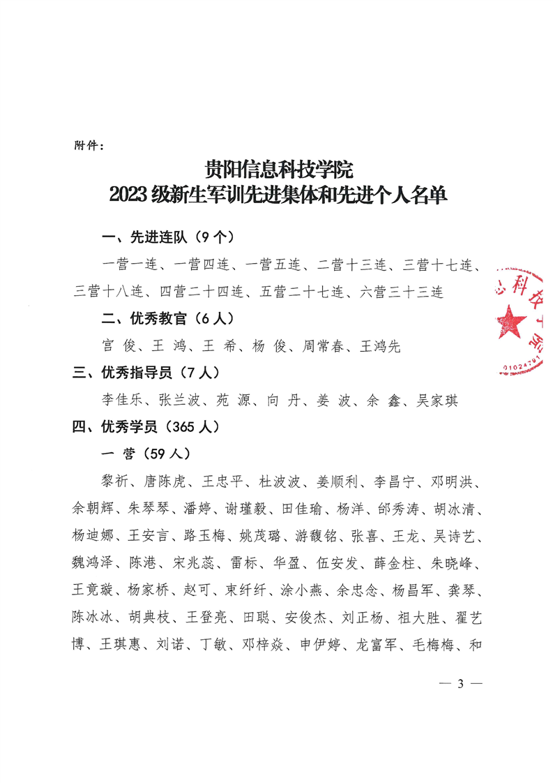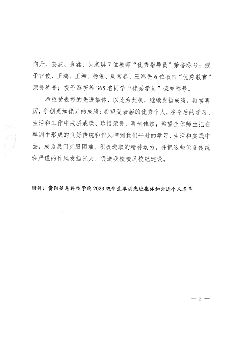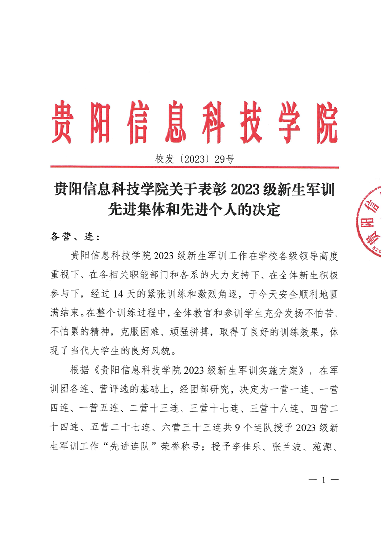 贵阳信息科技关于表彰2023级新生军训先进集体和先进个人的决定